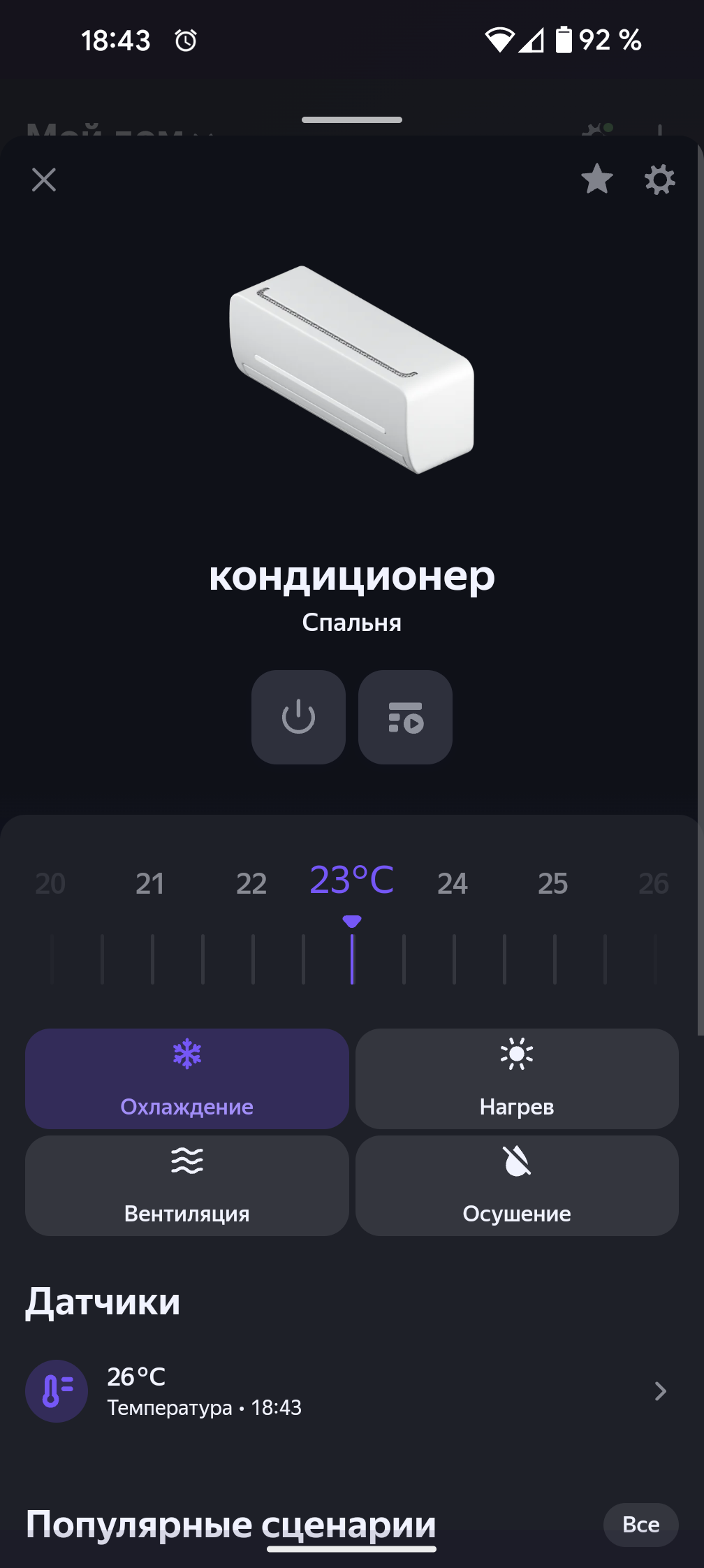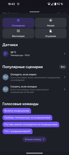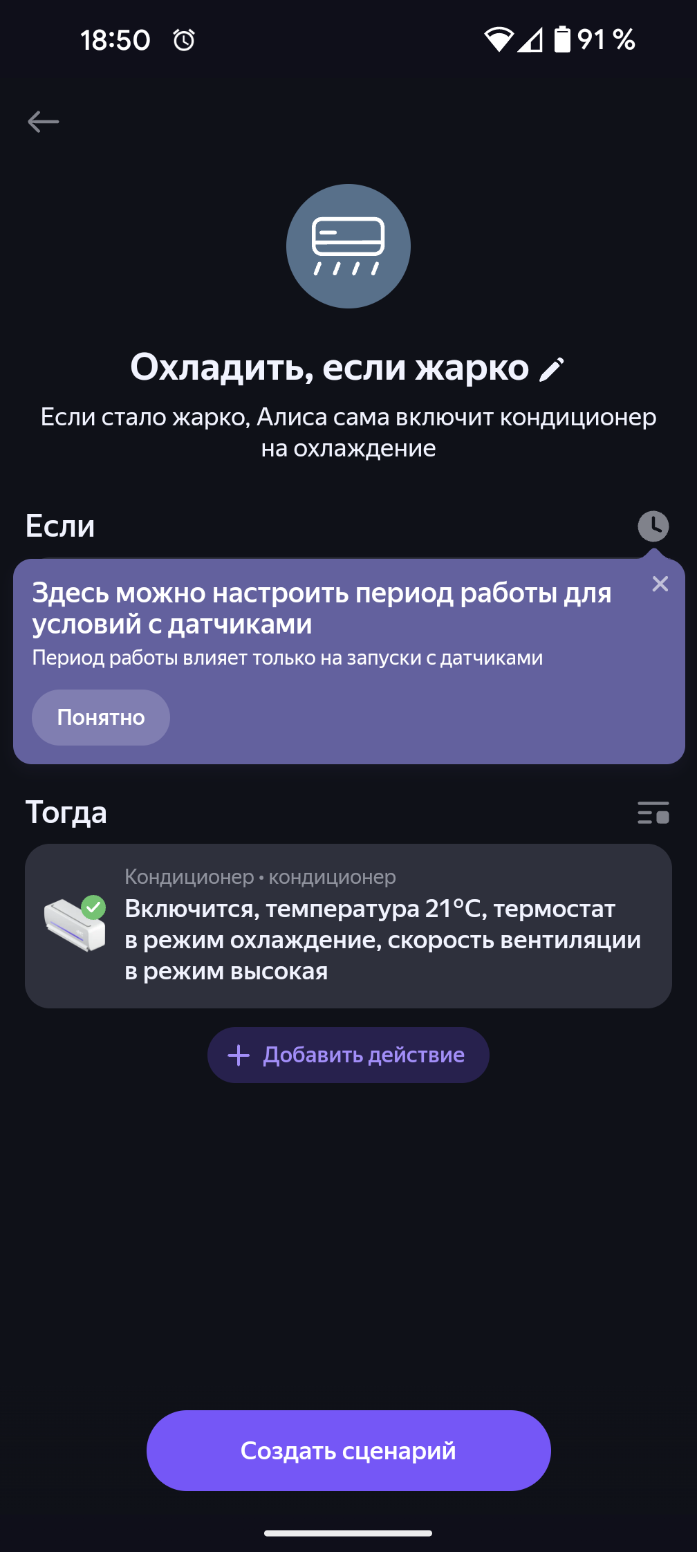 Приложение позволяет сделать кондиционер полноценным компонентом умного дома Яндекса. С помощью сценариев пользователь может настроить поведение устройства в зависимости от состояния внешних датчиков (к примеру, термометров) или от присутствия хозяев в доме.