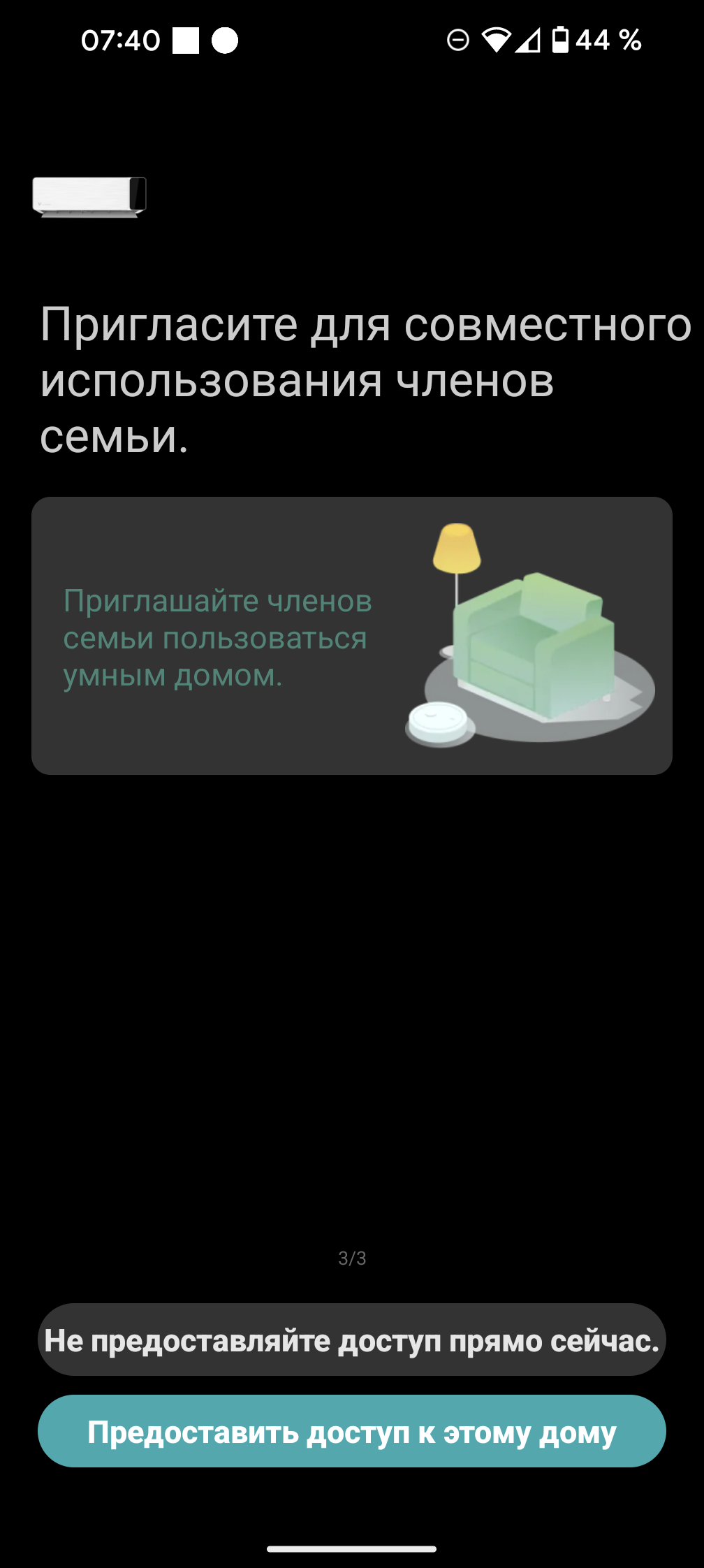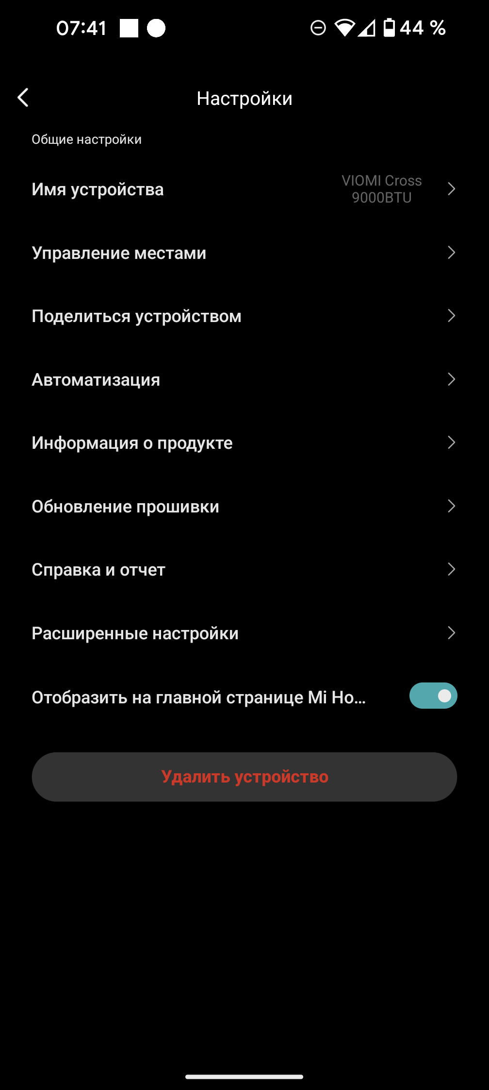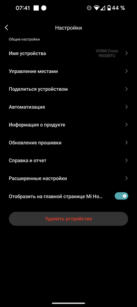 На странице настройки мы можем переименовать устройство, переназначить его в другое помещение нашего дома, поделиться правами на управление с членами семьи, ознакомиться со справочными материалами и проверить актуальность встроенного программного обеспечения.