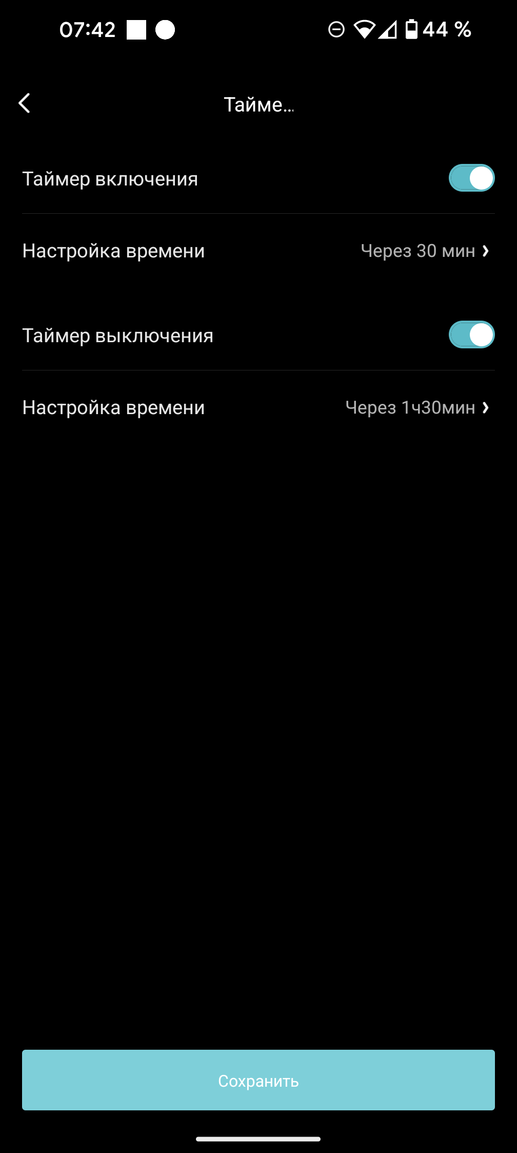 Приложение позволяет настроить два таймера: здесь можно установить отсрочку включения и выключения устройства.