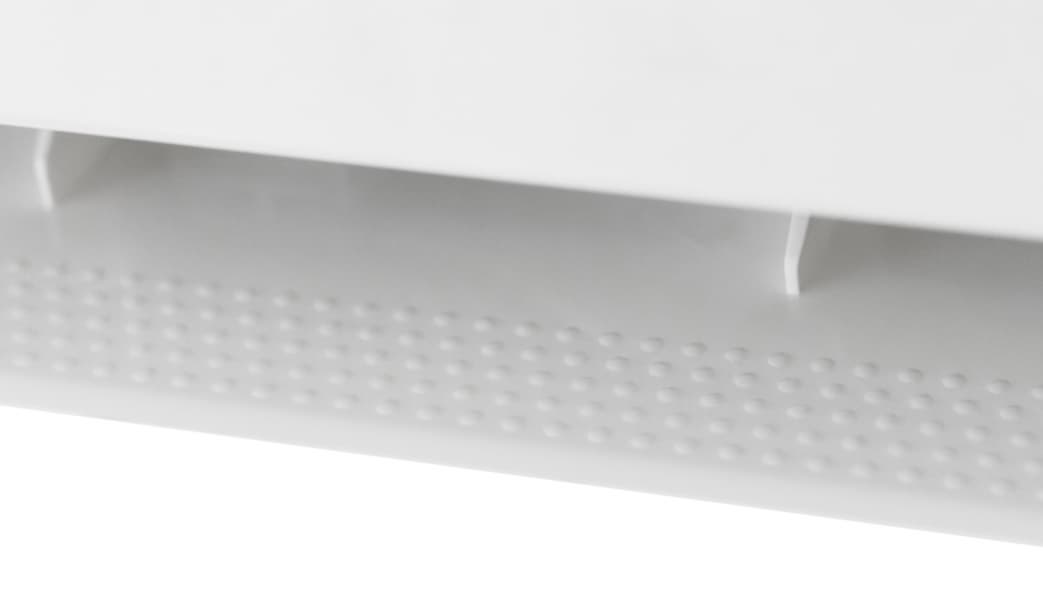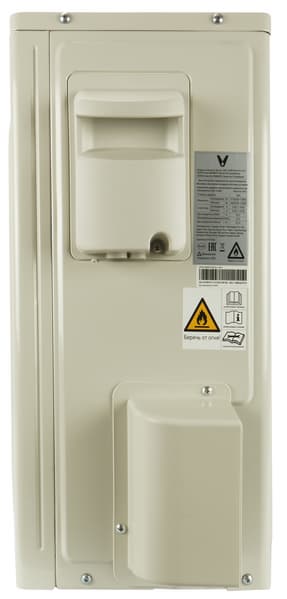Белый с легким желтоватым оттенком наружный блок украшен логотипом производителя без каких-либо дополнительных надписей. На передней стороне расположено традиционное вентиляционное отверстие, закрытое пластиковой решеткой в цвет корпуса.