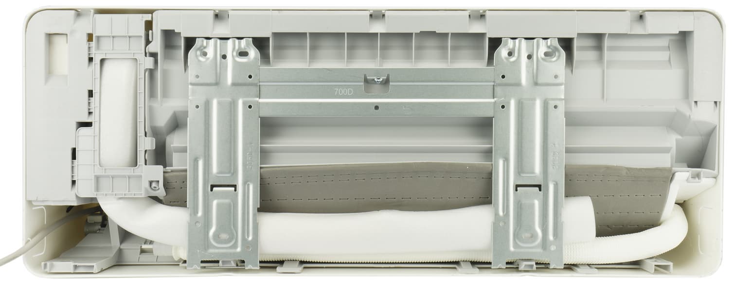 Медные трубки для подачи и возврата хладагента упакованы в теплоизолирующий материал. Рядом с ними проходит белая гофрированная трубка для вывода конденсата. Электропровод длиной 1,5 метра снабжен евровилкой с заземлением: если рядом с местом монтажа расположена розетка, можно не беспокоиться о коммутации.