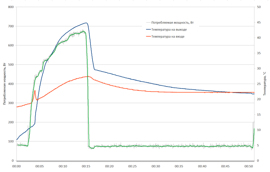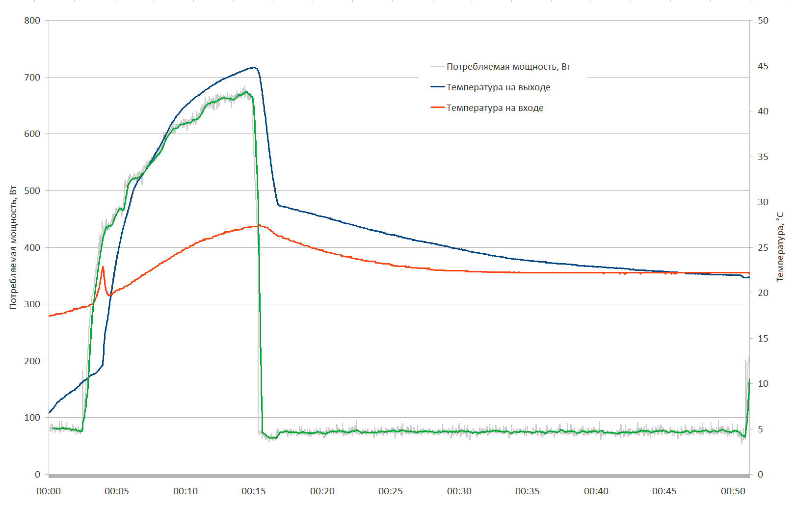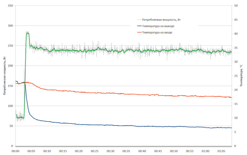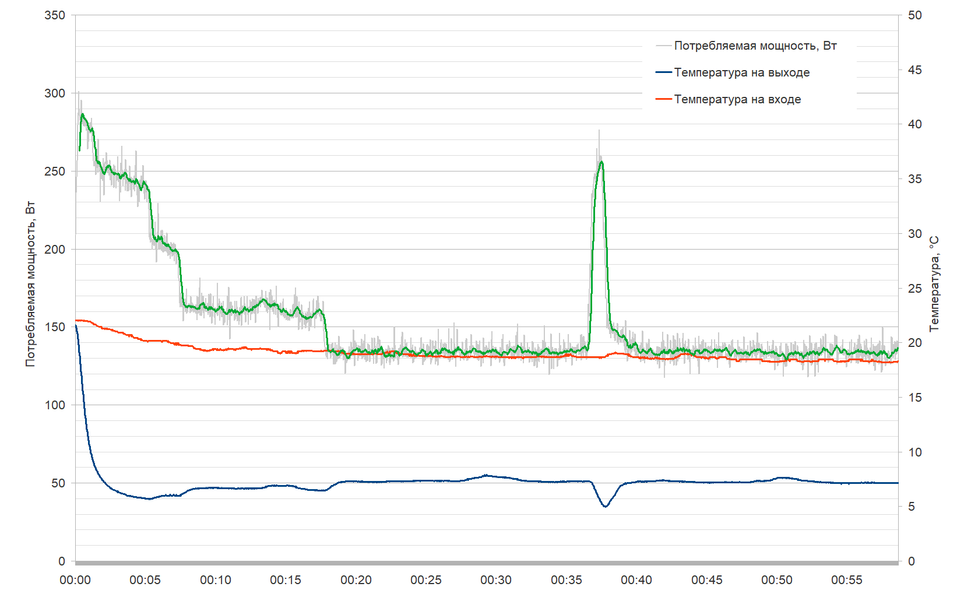 Чтобы продемонстрировать принцип работы устройства, мы разместили два температурных датчика на входе и выходе внутреннего блока и включили устройство в режиме охлаждения, установив целевую температуру на 18 °C. Одновременно измерялась и потребляемая устройством мощность.