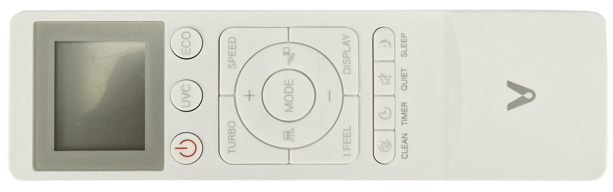На пульте — небольшой жидкокристаллический дисплей и множество кнопок. В центре квадратного блока располагается круглая «Mode», отвечающая за переключение режимов работы. Кондиционер может работать в режиме охлаждения, обогрева, осушения воздуха, вентиляции, а также в автоматическом режиме.
