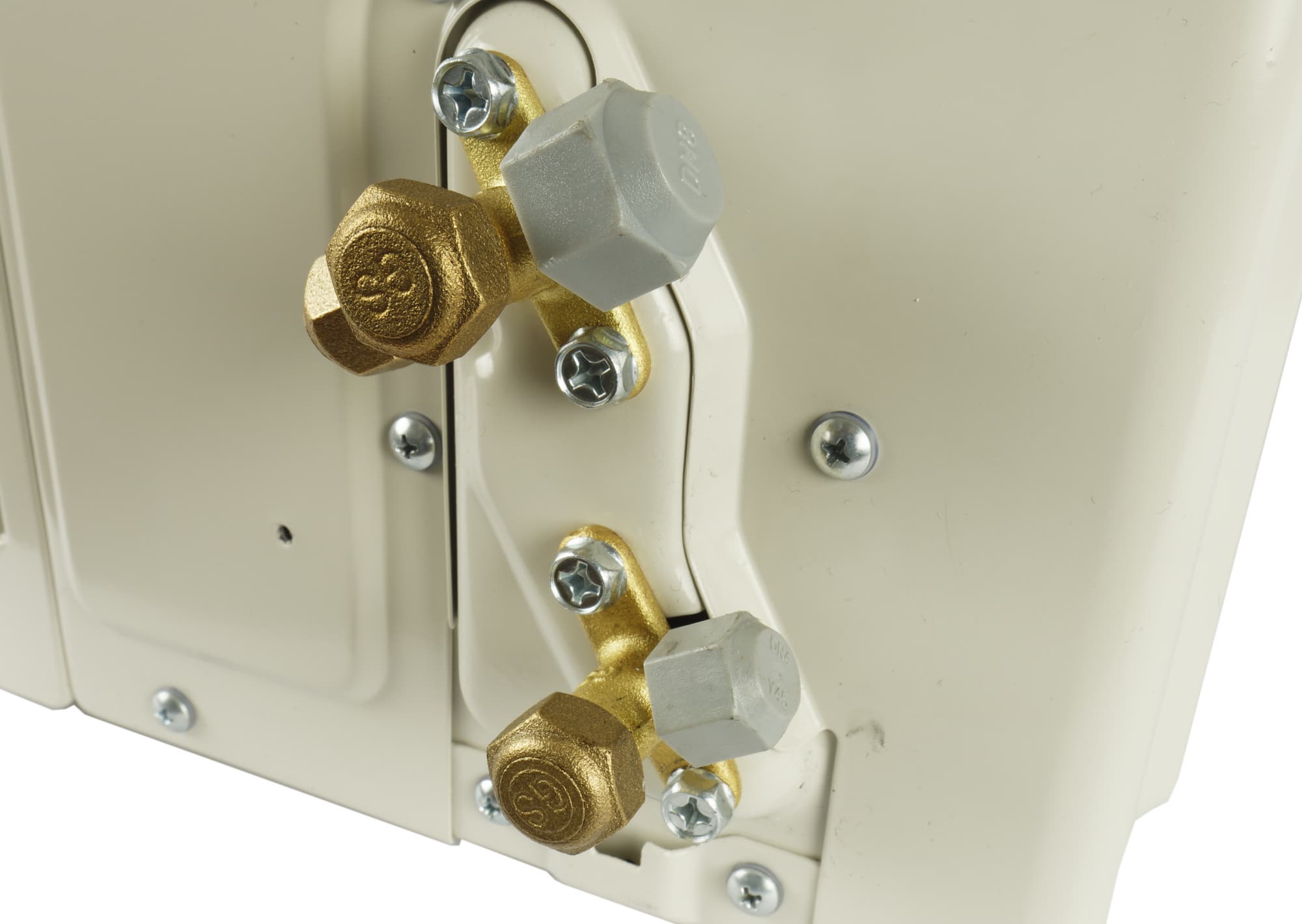 Разъемы и штуцеры для подключения трассы расположены на правой стороне корпуса и закрыты пластиковыми кожухами.