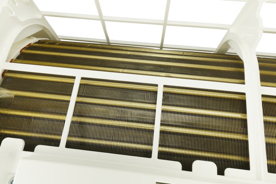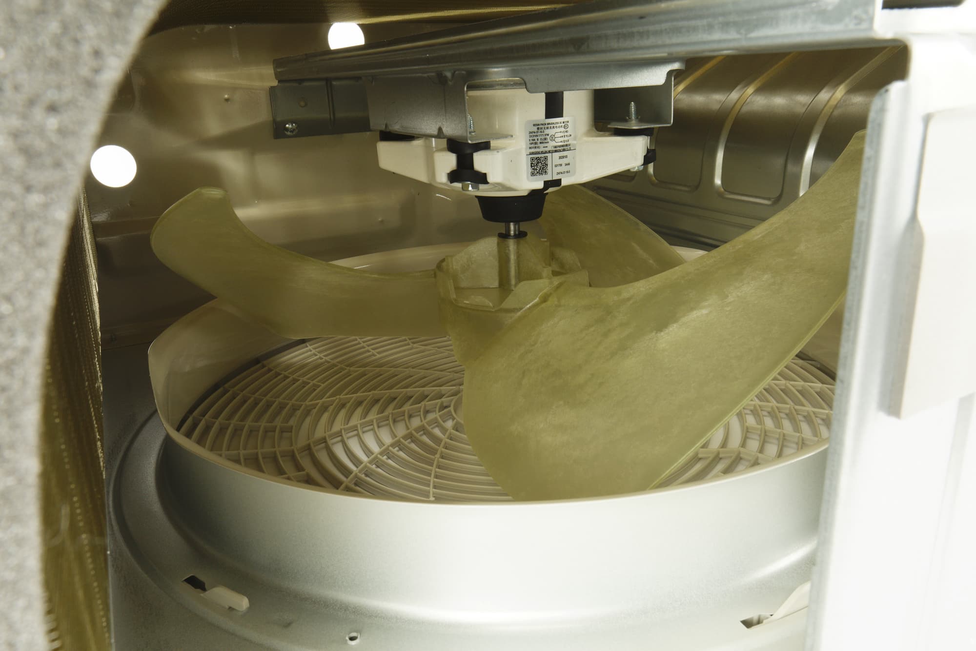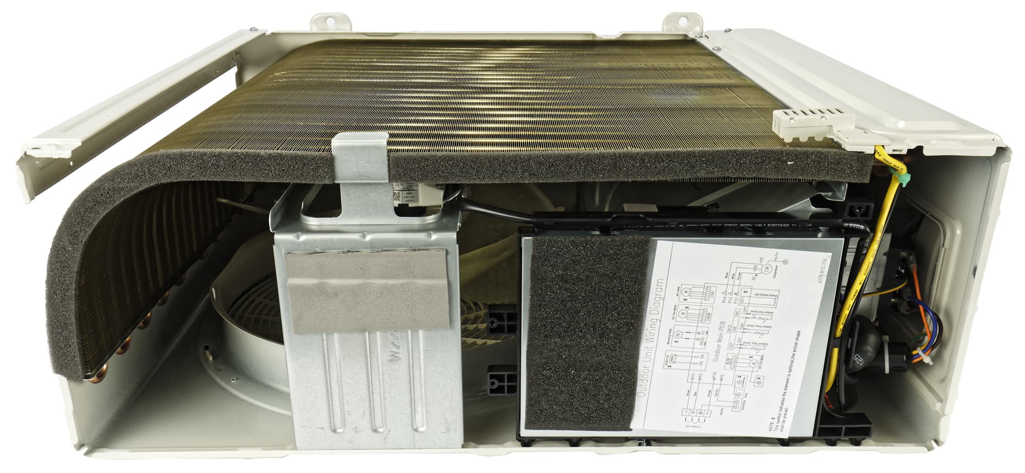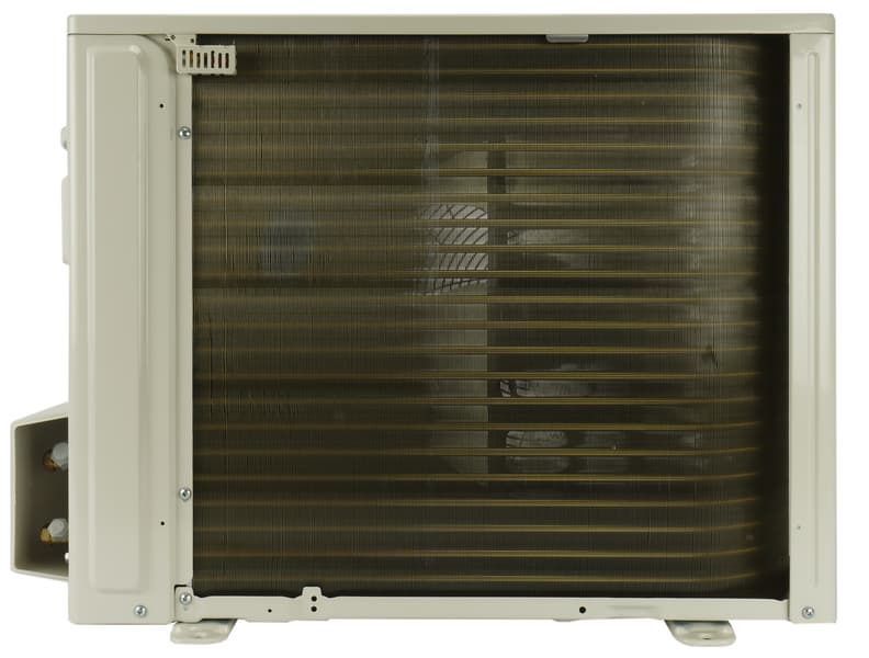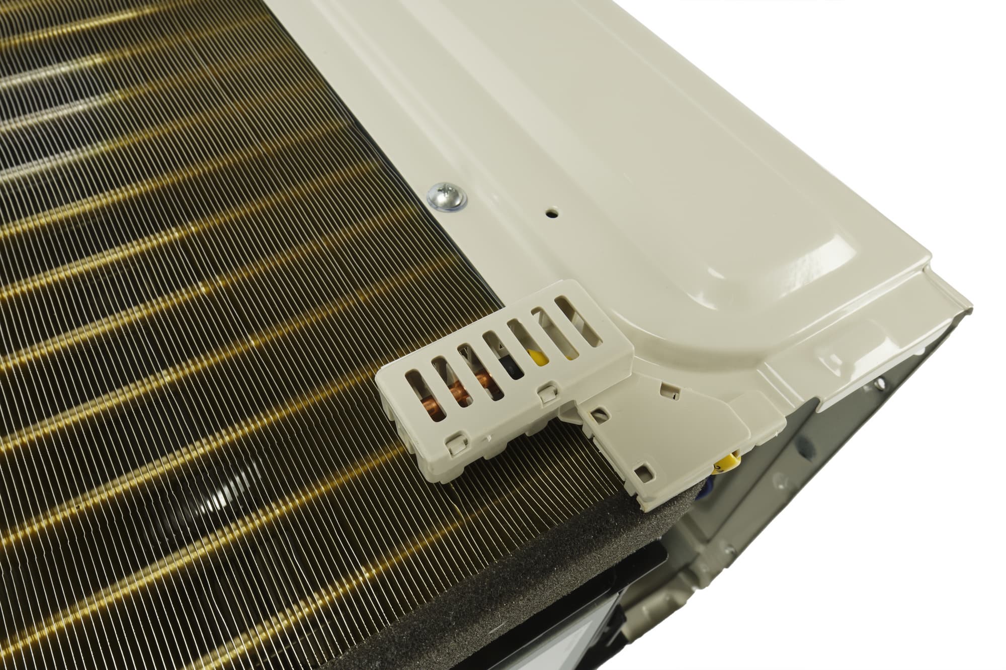 Трубки и ребра теплообменника защищены желтым анодированным покрытием — таким же, как и на внутреннем блоке.