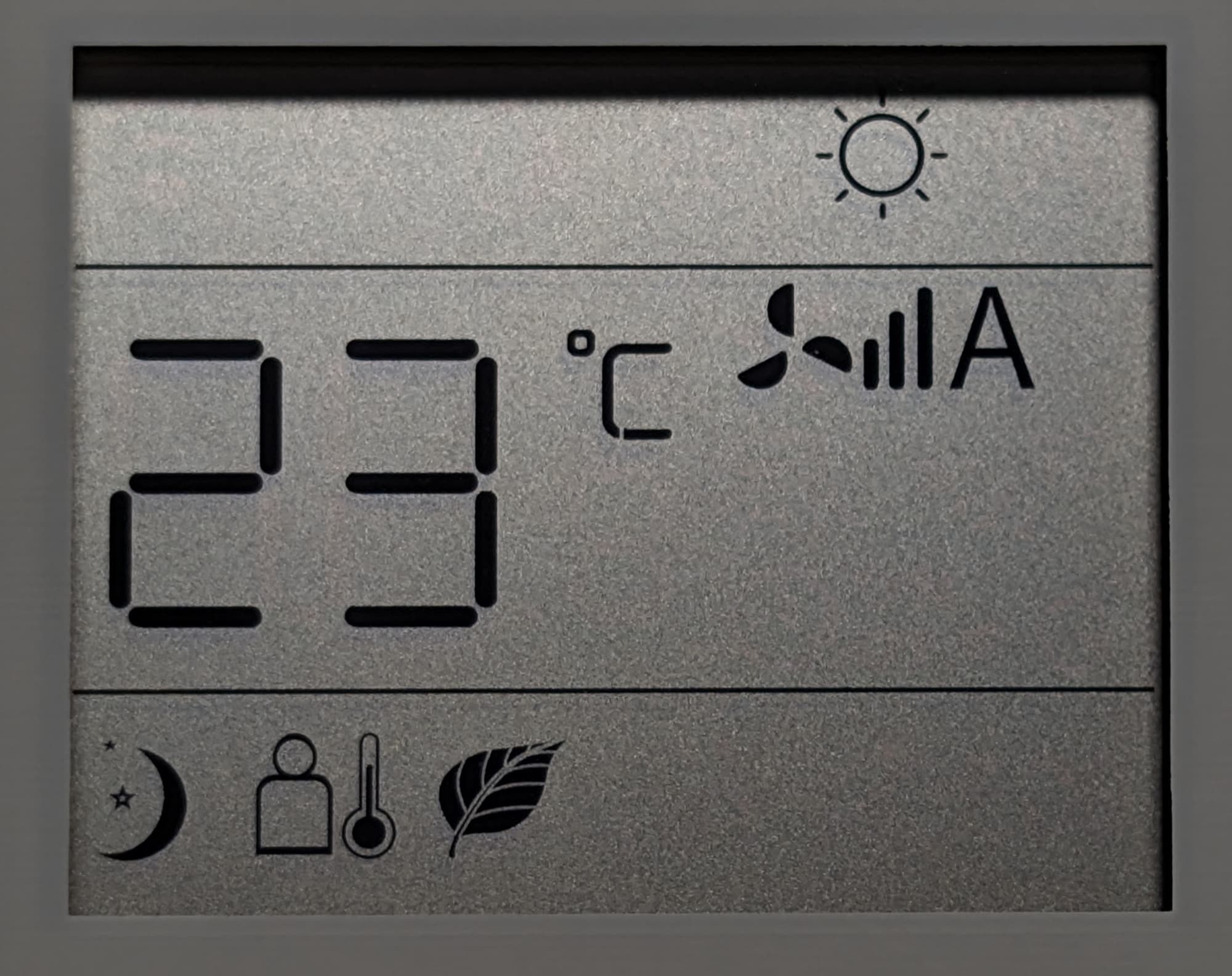 Крупные цифры в центральной части показывают целевую температуру, установленную пользователем. Рядом располагаются индикаторы скорости вращения вентилятора, движения вертикальных и горизонтальных жалюзи и активности таймера автоотключения.