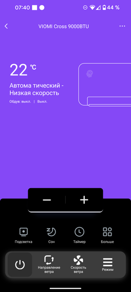 На главном экране приложения мы видим информацию о целевой температуре и режиме работы кондиционера. Кнопки в нижней части экрана позволяют переключить устройство на охлаждение, обогрев, осушение, вентиляцию и авторежим, управлять таймером и подсветкой, активировать ночной режим, а также настроить мощность вентилятора и направление потока в горизонтальной и вертикальной плоскостях.