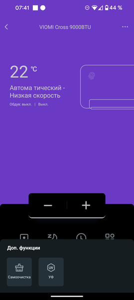 Кнопка «Доп. функции» открывает доступ к иконкам функций самоочистки и УФ-обработки.