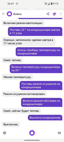 Кондиционер исправно отрабатывает команды, подаваемые Алисе вслух.