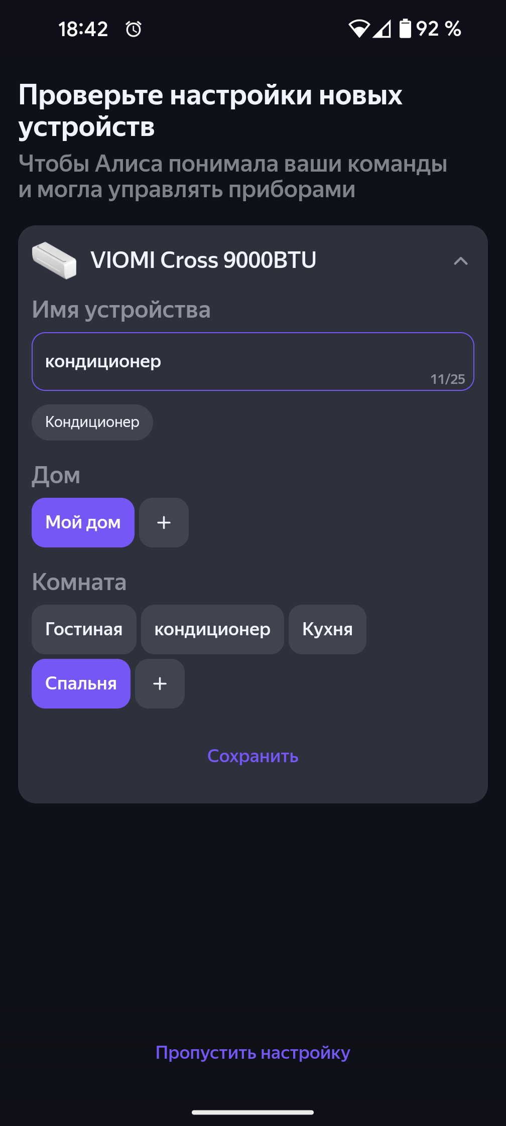 После этого остается только дать кондиционеру понятное имя и привязать устройство к выбранной комнате умного дома.