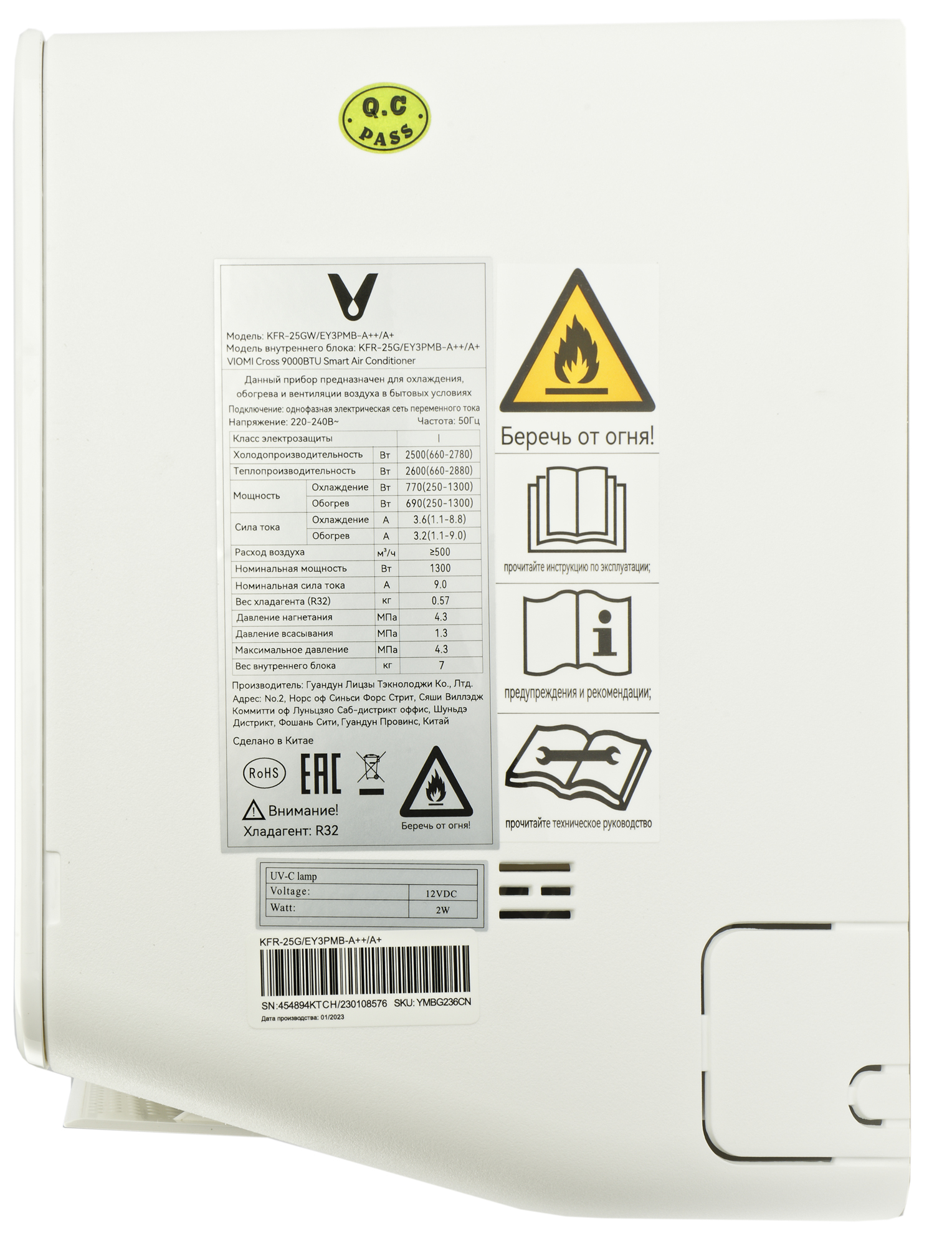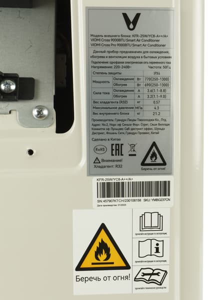 В линейке сплит-систем Viomi Cross представлены кондиционеры различной мощности (9000, 12000 и 18000 BTU) в двух цветовых решениях — белом и черном. Сегодня мы рассматриваем девятитысячную модель с белым внутренним блоком. Сплит-система состоит из внутреннего KFR-25G/EY3PMB-A++/A+ и наружного KFR-25W/YC8-A++/A+.