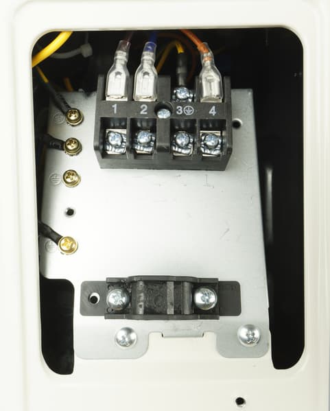 Под верхней крышкой размещается коммутационная панель с четырьмя клеммами.