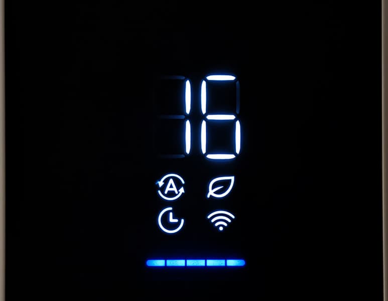 Дополняют дисплей четыре индикатора в средней части. При работе компрессора включается сигнал в виде буквы «A», обрамленной стрелками. Значок в форме листа зажигается при активации УФ-излучения, при включении таймера загорается символ циферблата, а при активации беспроводного соединения горит логотип Wi-Fi.