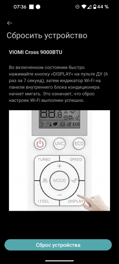 Чтобы добавить сплит-систему, следует воспользоваться значком «+» в правом верхнем углу главного экрана, после чего выбрать тип устройства — «кондиционер». Приложение выдает подробные и понятные инструкции по активации режима сопряжения: необходимо быстро (6 раз за 7 секунд) нажимать на кнопку «Display» на пульте управления до тех пор, пока прибор не издаст звуковой сигнал, а индикатор «Wi-Fi» не начнет мигать.