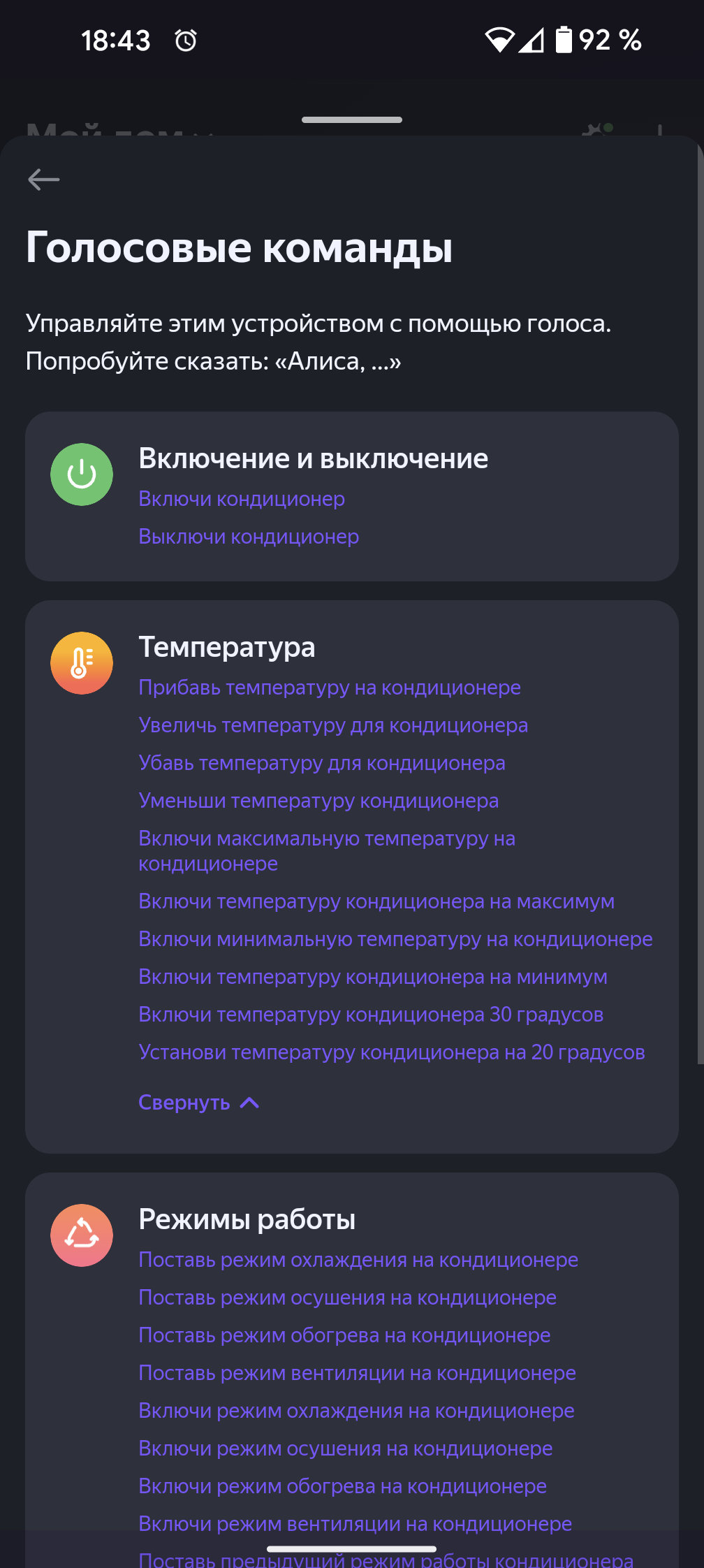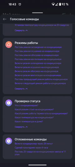 Приложение поддерживает множество команд, позволяющих менять режимы кондиционера, проверять статус устройства и планировать его работу с помощью отложенных команд. На странице мы видим примеры использования голосового помощника.