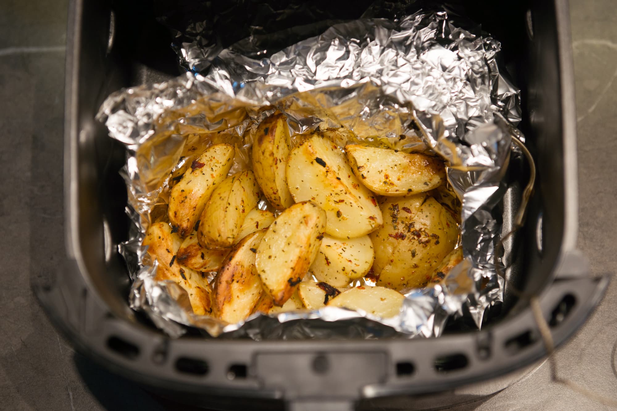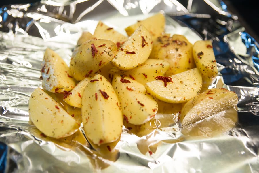 В следующий раз мы задействовали оба уровня. Картофель разрезали на четвертинки, сбрызнули маслом и натерли специями. Выложили овощи на фольгу и разместили на дне корзины.