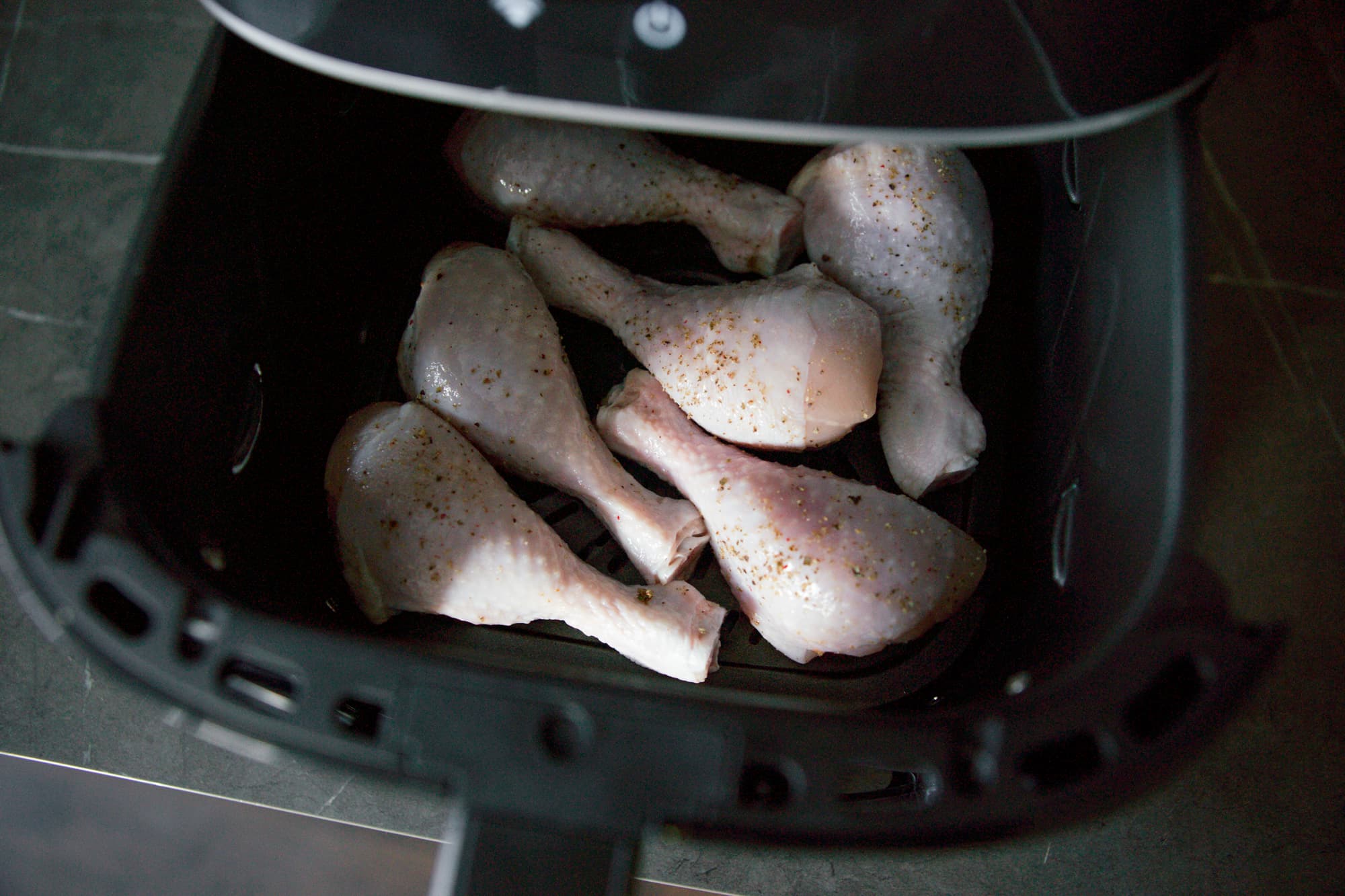 Постепенно мы добрались и до 6-го режима, на котором рекомендуется запекать куриные ножки. Программа по умолчанию предлагает 200 °C на 25 минут. Решили ничего не менять и разместили голени общим весом 850 г на лотке.