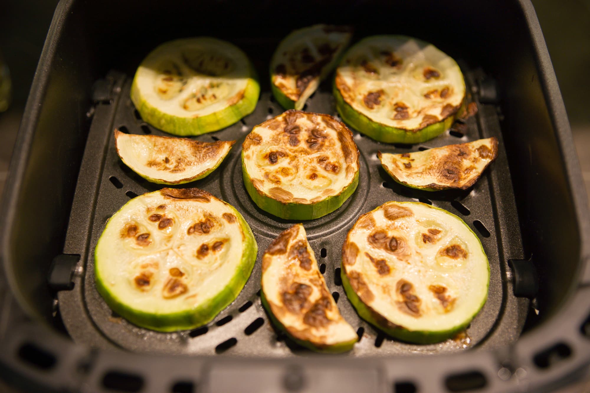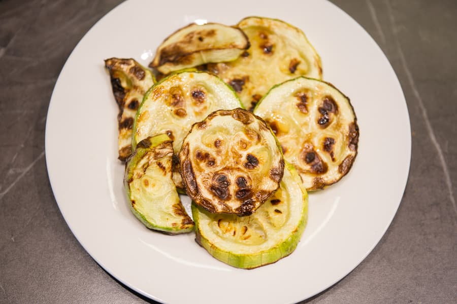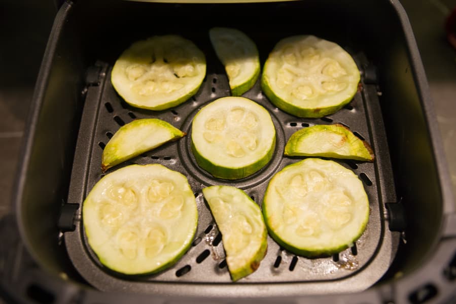 Нарезали овощ на толстые кружочки, дали им полежать в соли, промокнули лишнюю жидкость салфеткой, смазали каждый маслом и уложили на лоток. При 180 °C кабачок готовился 15 минут.
