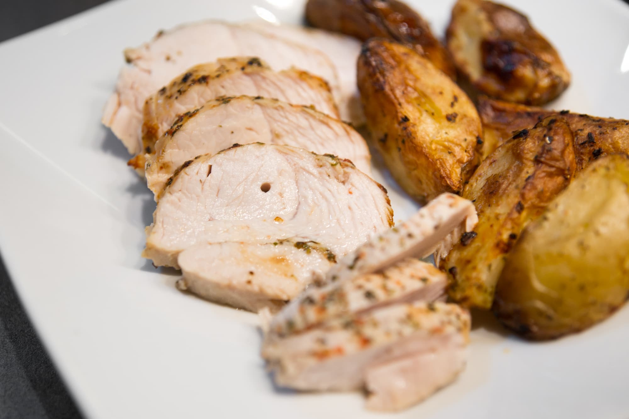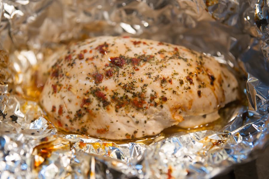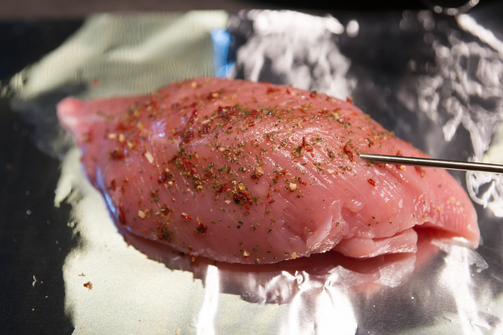 Полукилограммовую грудку индейки слегка смазали маслом, обсыпали смесью измельченных сушеных томатов, чеснока и трав, посолили, воткнули термощуп, завернули в фольгу и разместили на лотке.