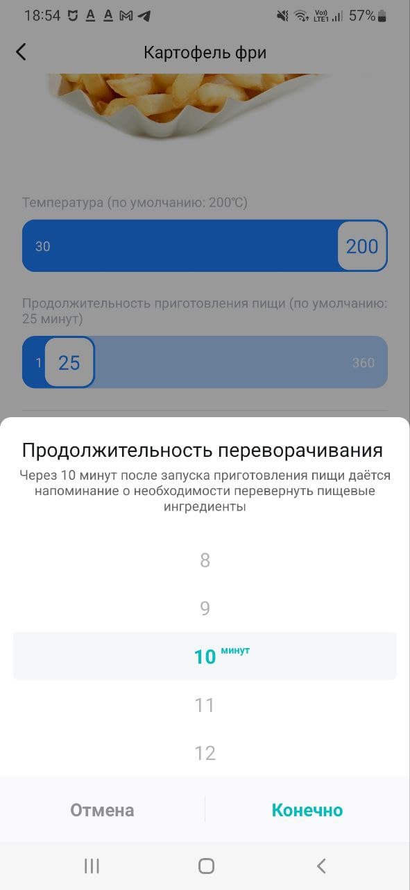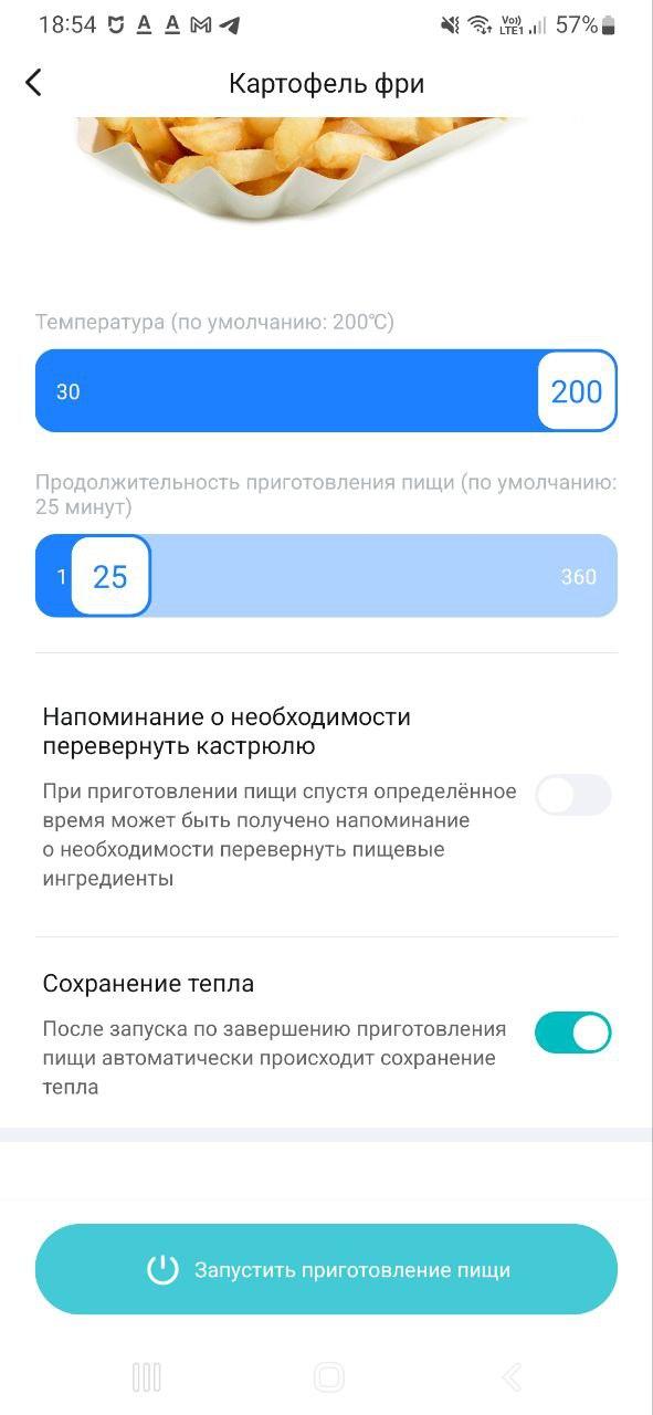 | Картофель-фри | 200 °C | 30—200 °C | 25 минут | 1 минута — 6 часов | 13 минут | 1—24 минуты |