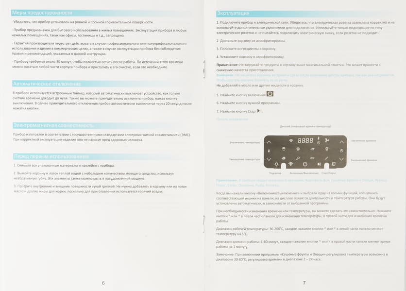 Для начала мы помыли корзину и лоток с моющим средством, протерли все поверхности прибора влажной тканью и на всякий случай прогрели его на максимальной температуре 20 минут, хотя в инструкции таких указаний не было. Никаких посторонних запахов или дыма прибор при первом включении не издавал.