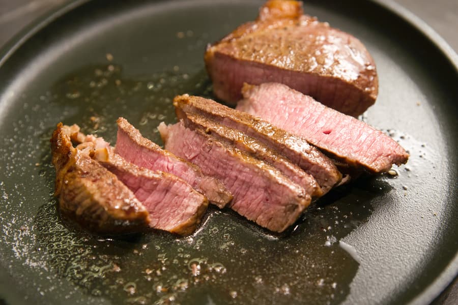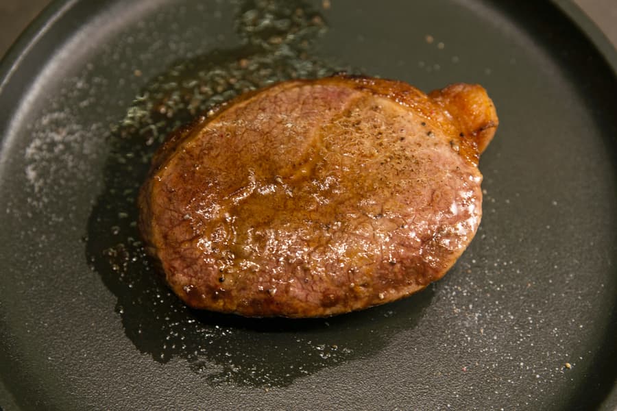 Говяжий стейк мы не «запечатывали» предварительно на сковородке, а сразу отправили в камеру. Лоток установили на средний уровень. Мясо было комнатной температуры, солью и перцем перед жаркой мы его не посыпали, а лишь смазали незначительным количеством масла с обеих сторон. Для точности воткнули термощуп. Аэрогриль работал при 200 °C. До 58 °C стейк дошел за 4 минуты. Почти готовое мясо переложили на тарелку, с обеих сторон посыпали солью и перцем, плотно закрыли фольгой и оставили немного отдохнуть.