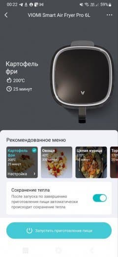 По завершении цикла раздается пять звуковых сигналов, аэрогриль автоматически переходит на температуру 80 °C до того момента, пока пользователь не выключит ее самостоятельно. Отключить автоподогрев до начала работы можно только при управлении через приложение. Об этом ниже.