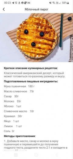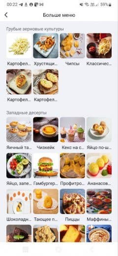 В основном меню представлено 95 рецептов. Все они разбиты по категориям и снабжены фотографиями, подробным описанием приготовления и списком необходимых ингредиентов.