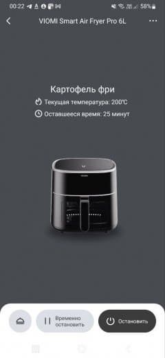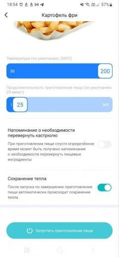 Прямо из рецепта можно запустить приготовление, откорректировать температуру и время, поставить таймер-напоминание, а также включить или отключить автоподогрев по окончании цикла. В процессе на экране отображаются установленные параметры и время до окончания готовки.