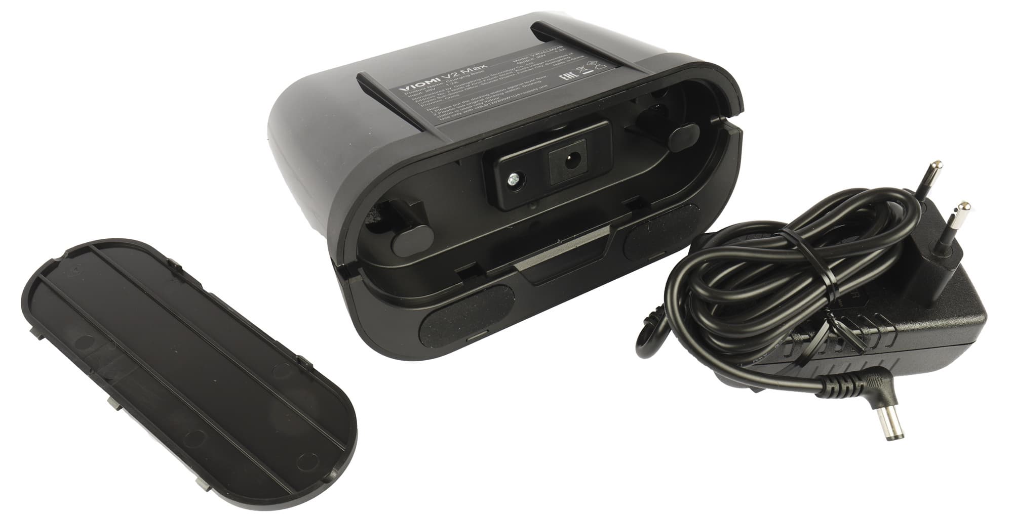 У базы Viomi V2 довольно оригинальная конструкция: подпружиненные контакты касаются боковой, а не нижней части пылесоса. Такое решение позволяет уменьшить габариты и сократить «мертвую зону» вокруг зарядного устройства.