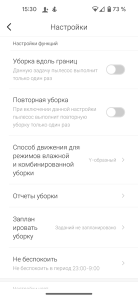 Раздел настроек предложит пользователю включить режим обхода периметра помещения или повторной уборки. Эти опции доступны для следующего запуска, а после окончания работы автоматически отключаются.