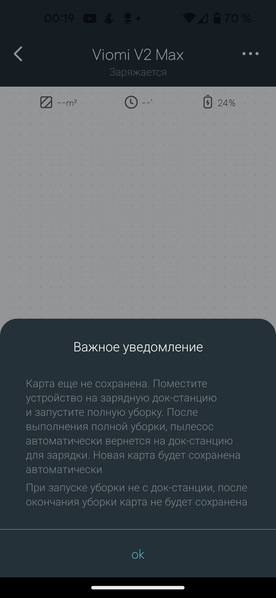 Перед стартом приложение предупреждает: сначала устройству нужно создать карту, а потом уже его можно будет полноценно использовать: редактировать карты и задавать параметры работы. Так что сначала придется провести минимум одну полную уборку в автоматическом режиме и дождаться возвращения пылесоса на базу.
