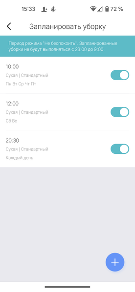 Автоматический запуск можно настроить в любое удобное время суток и любой день недели — причем и помещение, в котором надо прибраться, тоже можно выбрать в этом разделе. Мы решили, что в 10 утра будних дней и в полдень выходных можно убрать всю квартиру и еще раз подмести вечером.