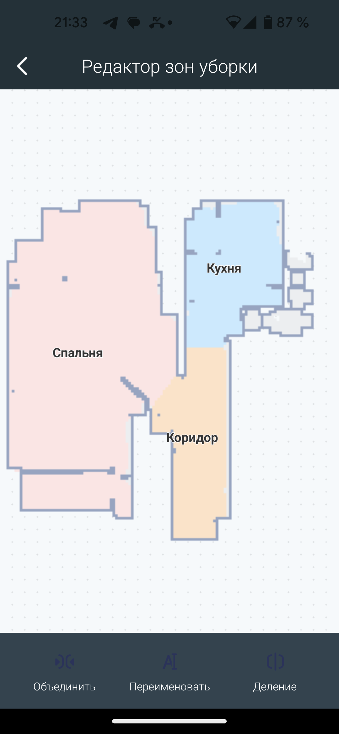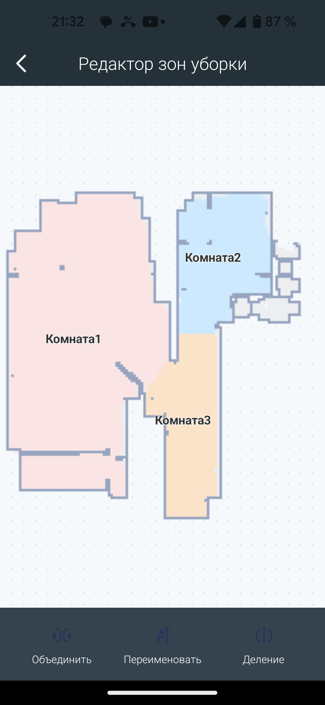 Когда первая автоматическая уборка закончится, в приложении появится карта помещения, уже разделенная на разноцветные комнаты. Если размечены они недостаточно точно, можно поправить их в «редакторе карт»: в нем можно изменить границы помещений и переименовать их.