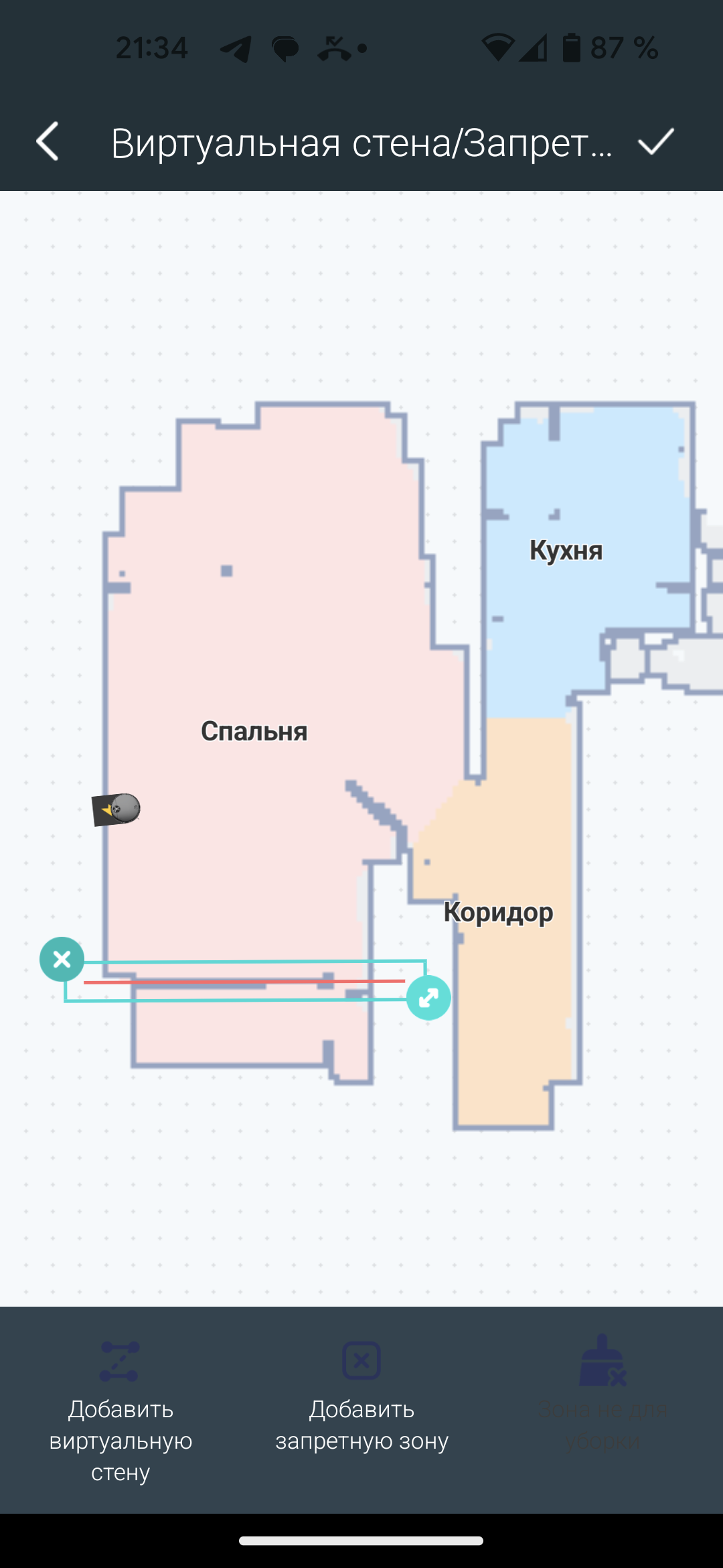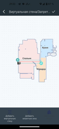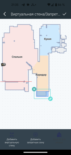 Здесь же есть инструменты запретов. «Виртуальная стена» проводит на карте непреодолимую для робота границу, а «запретная зона» отмечает прямоугольник, куда он не должен заходить. Третья опция, в нашей версии приложения она оказалась без названия, задает участок, где не надо мыть полы.