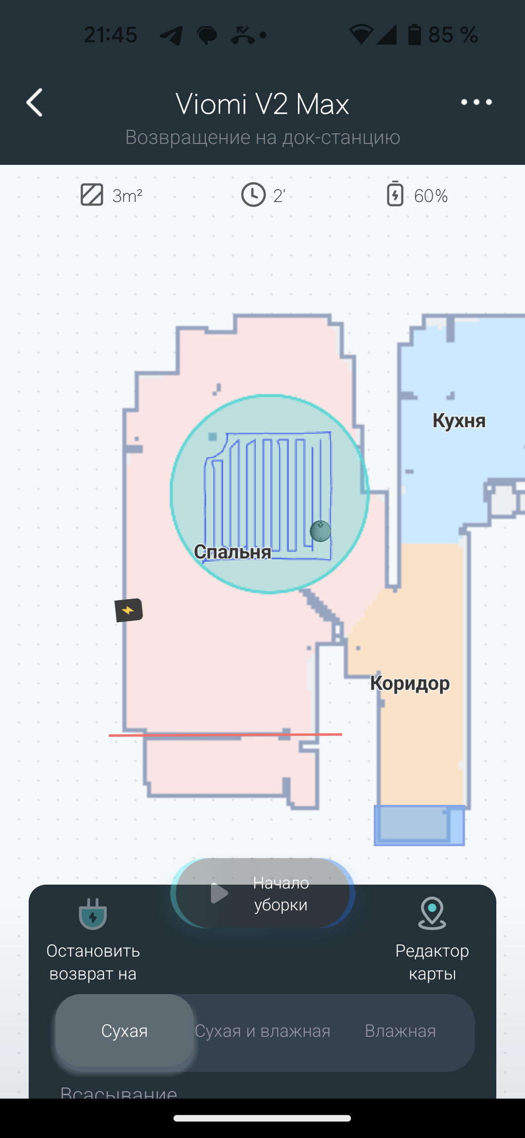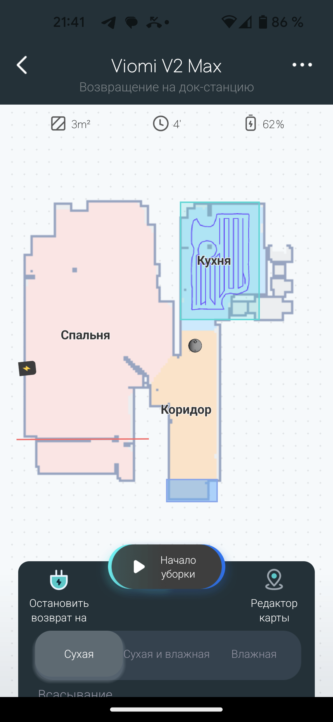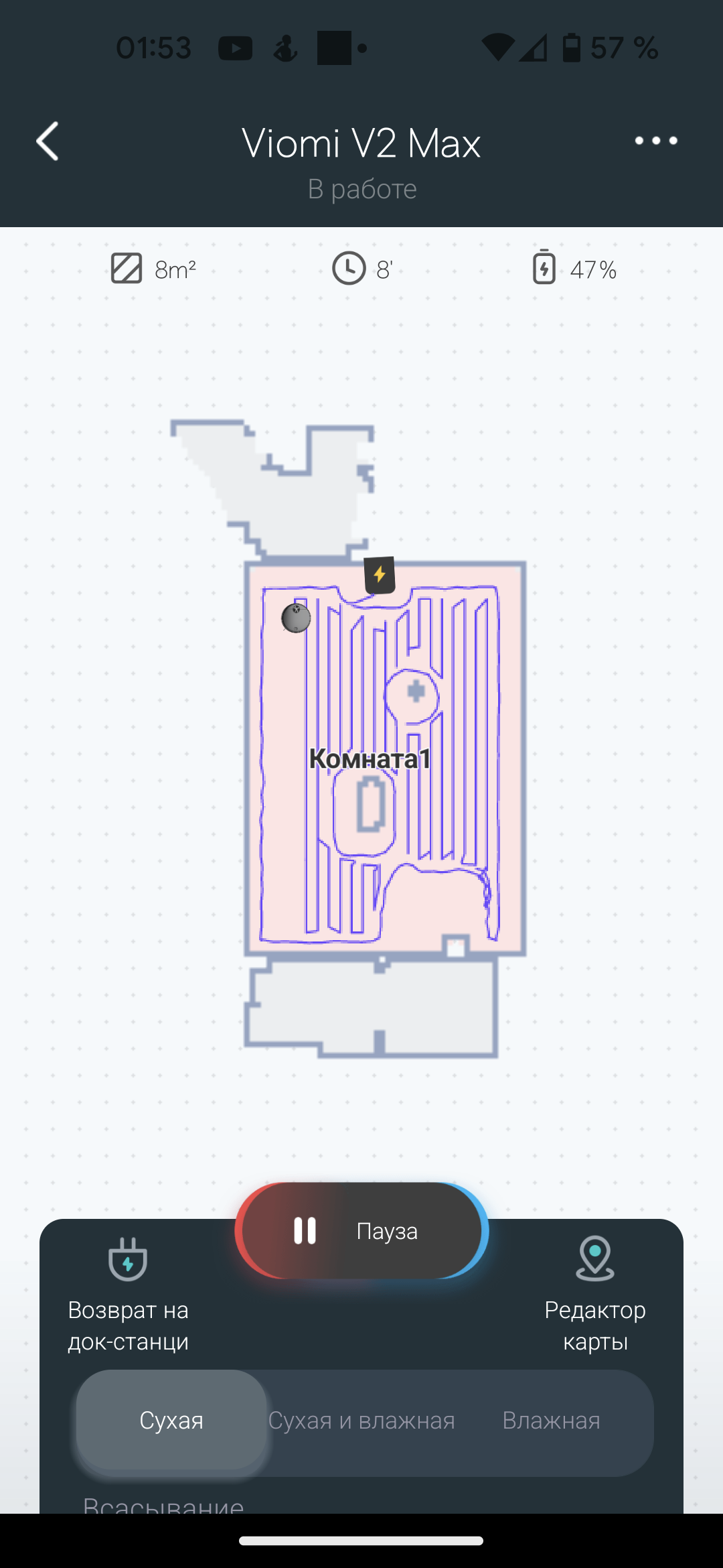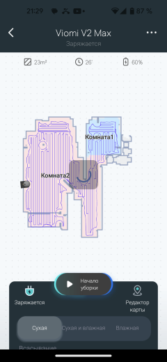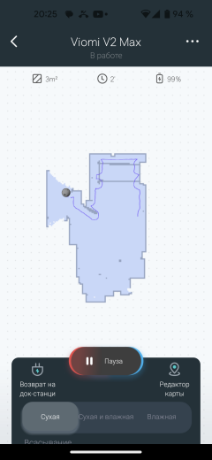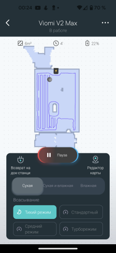 Внизу можно переключать типы уборки (сухая/влажная/сухая и влажная) и режимы работы (четыре уровня мощности). Между этим разделом и картой есть еще кнопки возвращения на базу и вызова редактора карт — напомним, он станет доступен только после первой автоматической уборки.