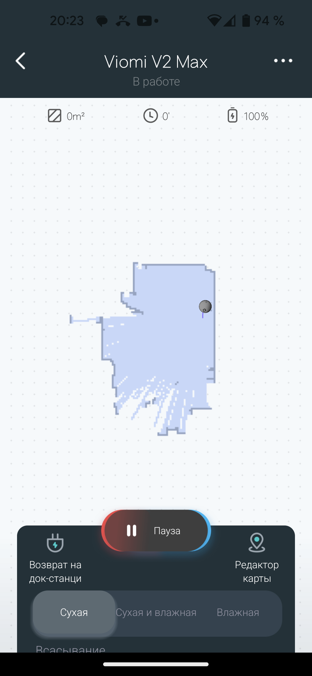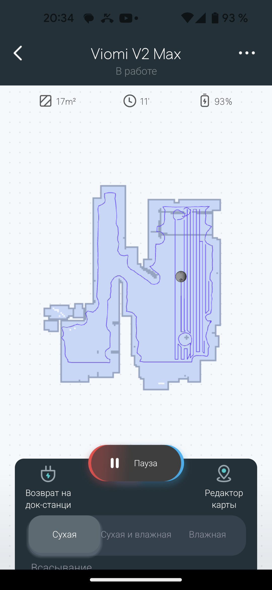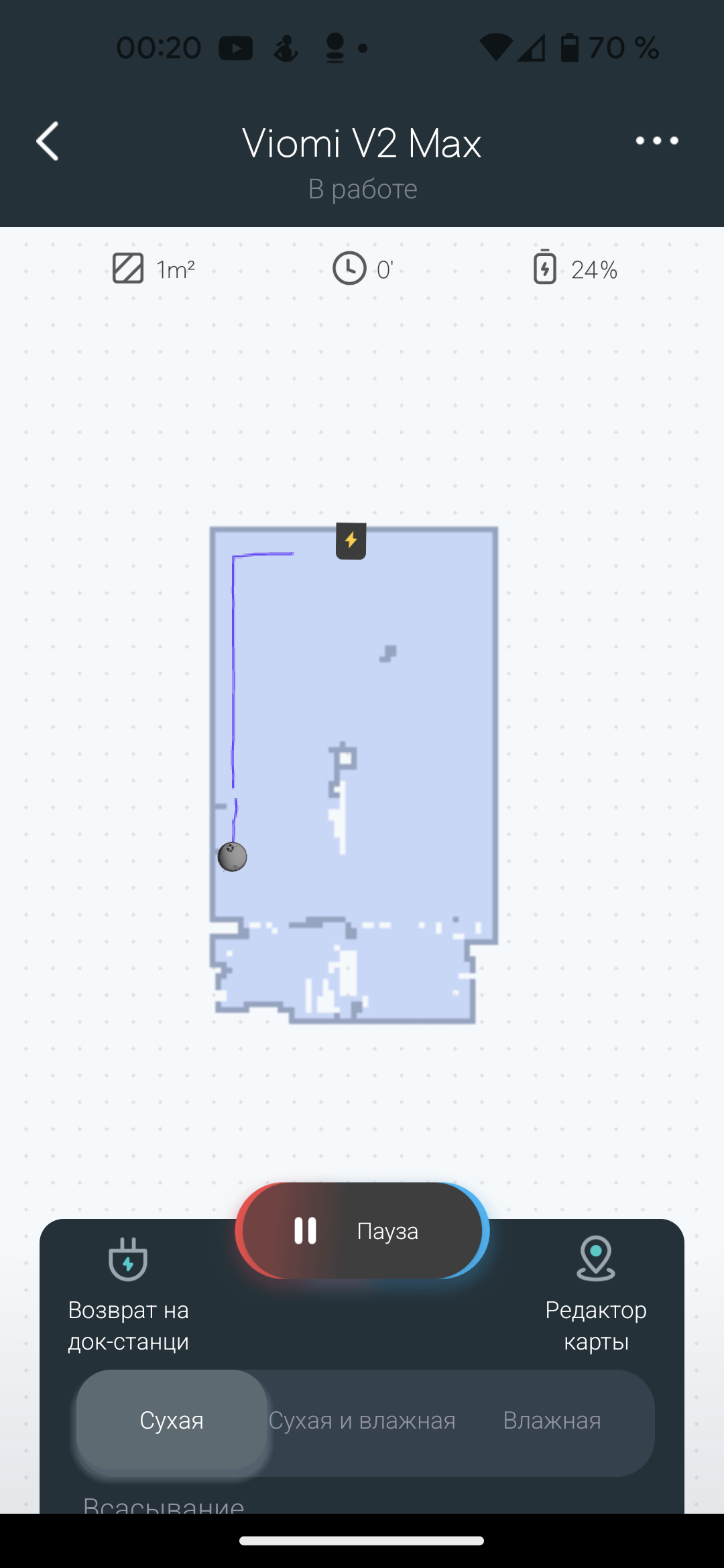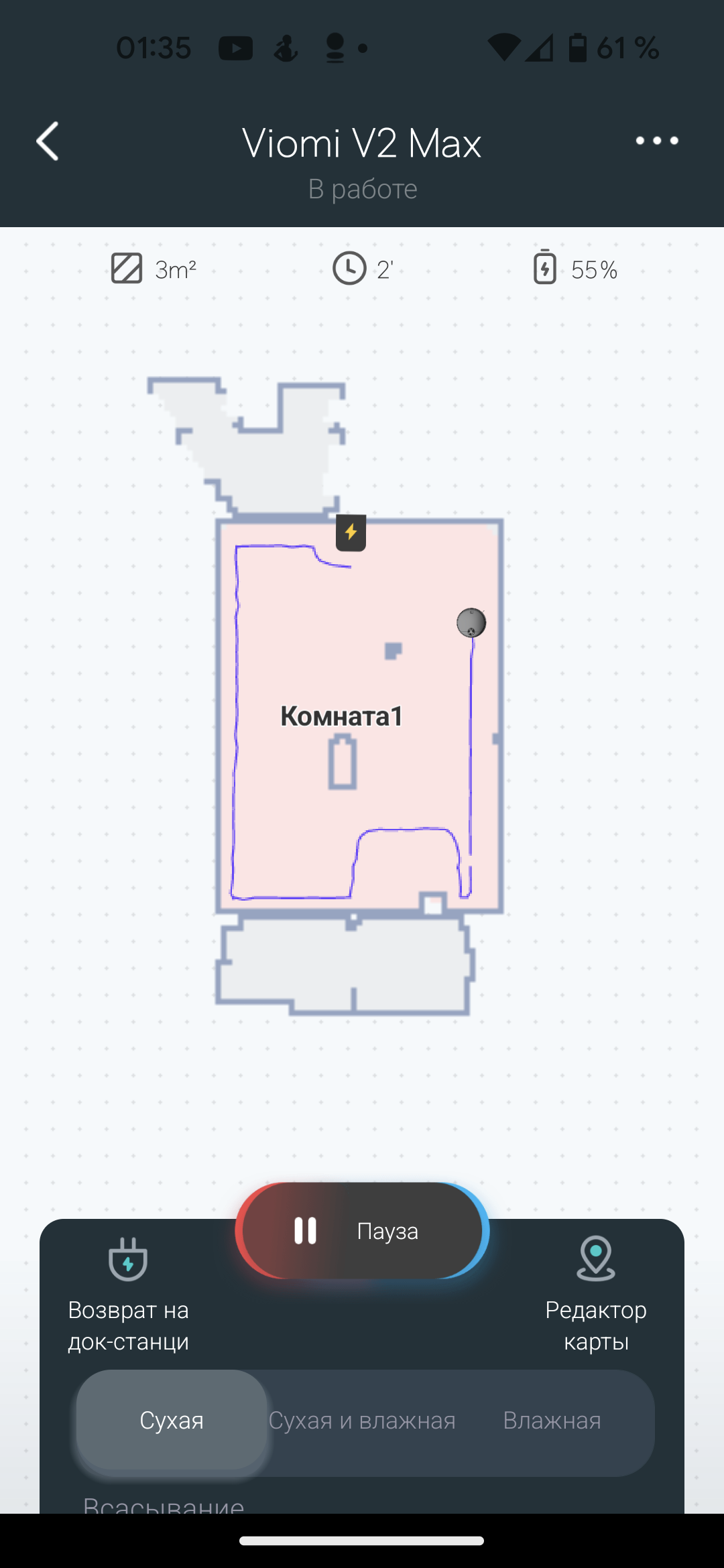 Внизу можно переключать типы уборки (сухая/влажная/сухая и влажная) и режимы работы (четыре уровня мощности). Между этим разделом и картой есть еще кнопки возвращения на базу и вызова редактора карт — напомним, он станет доступен только после первой автоматической уборки.