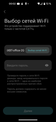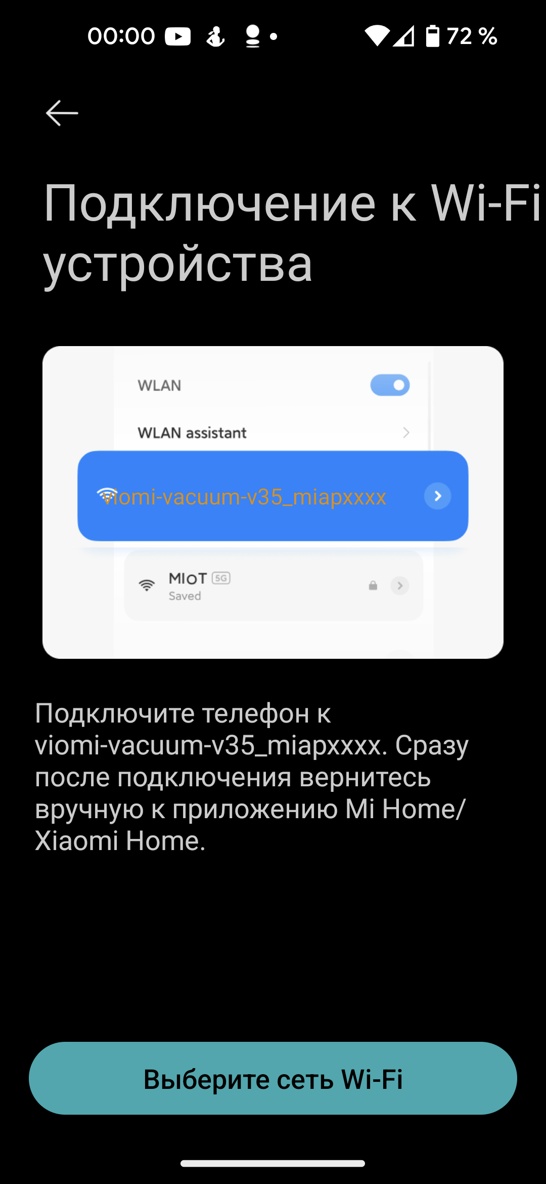 Несколько секунд приложение сканирует беспроводные сети, после чего предлагает перейти к ручному подключению. Для этого требуется войти с телефона в созданную пылесосом сеть с SSID «viomi-vacuum-v35-miapXXXX» и сообщить устройству необходимые параметры Wi-Fi. Как и большинство приборов IoT, наша модель работает только в диапазоне 2,4 ГГц.