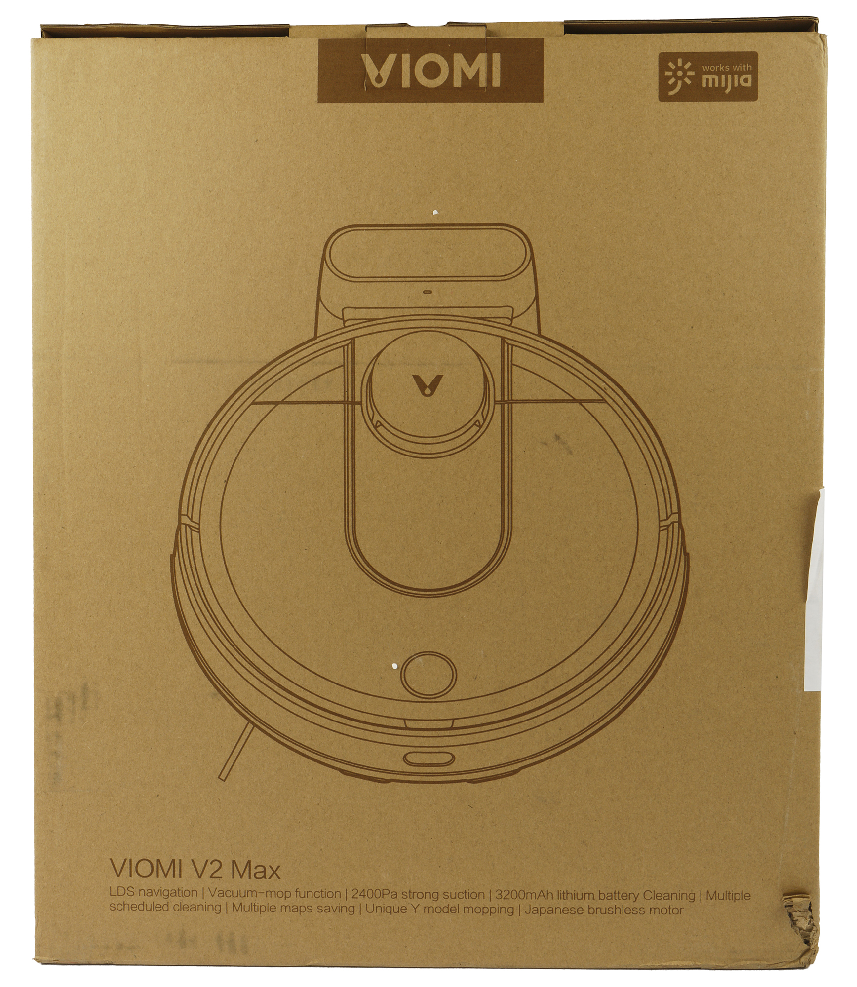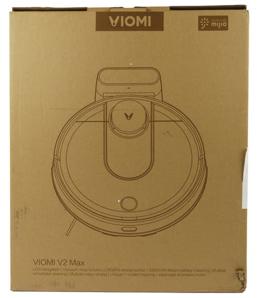 Пылесос Viomi V2 Max поставляется в коробке из коричневого картона. Информации на ней не слишком много: изображение устройства, стоящего на базе, товарный знак производителя и логотип Mijia —экосистемы умного дома, работу с которой поддерживает прибор.