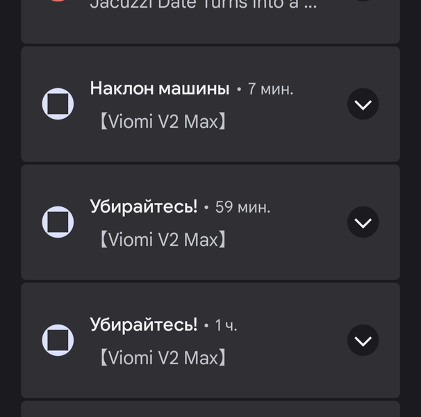 В арсенале взаимодействия с владельцем есть и пуш-уведомления. Однако переведены они так, что не всегда поймешь, о чем речь. Например, получив сообщения на скрине выше, мы задумались, действительно ли пылесос гонит нас из дома. Оказалось, что это оповещение об успешно завершенной работе.