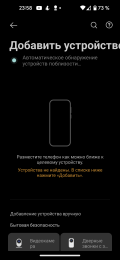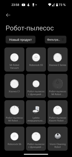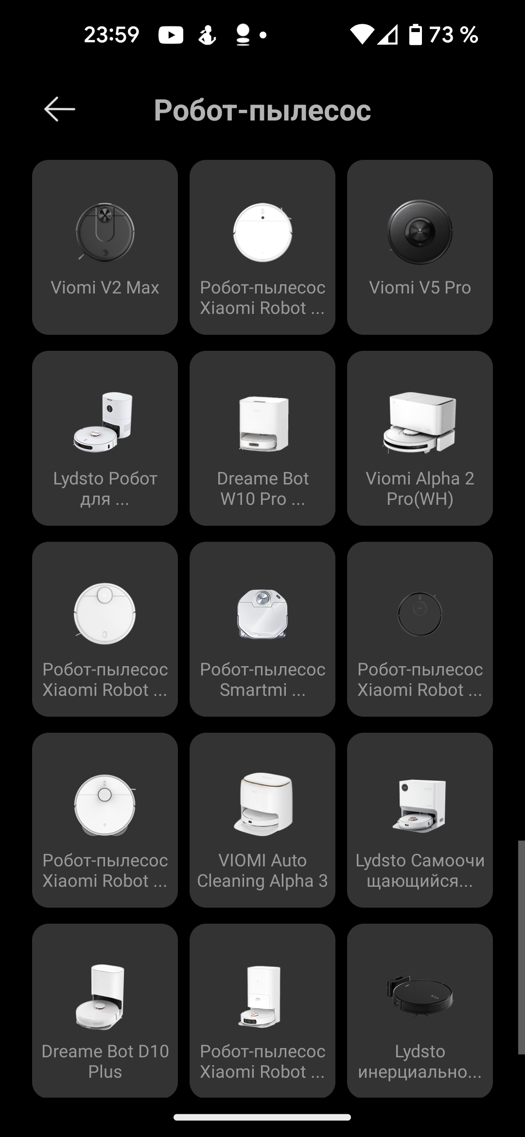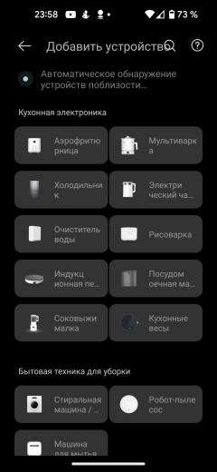 Теперь мы можем добавить Viomi V2 Max в приложение. Автоматическое обнаружение не поддерживается: следует вручную выбрать класс устройства в обширном списке. Нас интересует «Робот-пылесос» в категории «Бытовая техника для уборки».