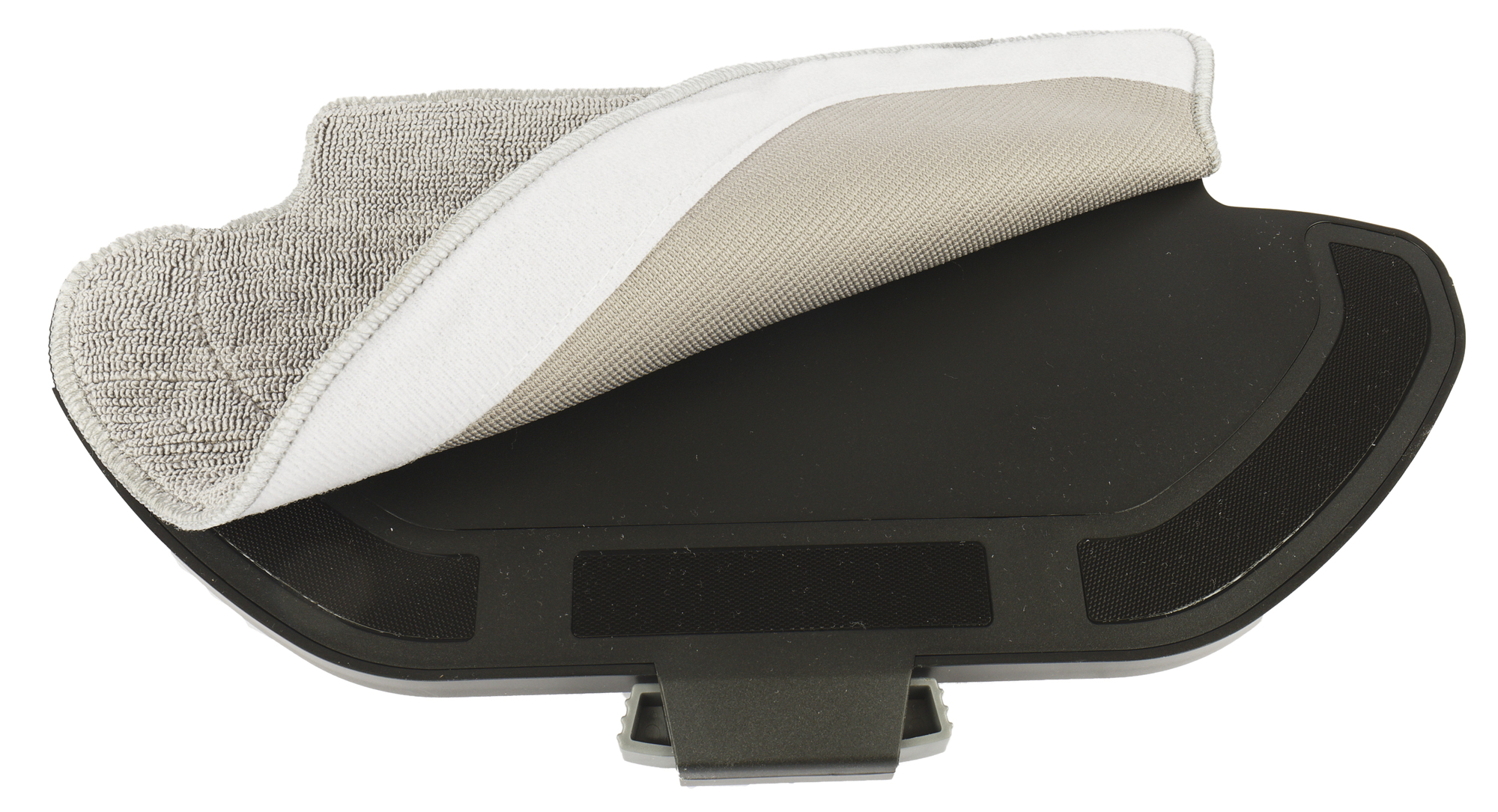 Салфетка для влажной уборки закрепляется на специальной рамке, устанавливаемой на нижнюю сторону прибора, и удерживается липучками-велкро и текстильной резинкой.