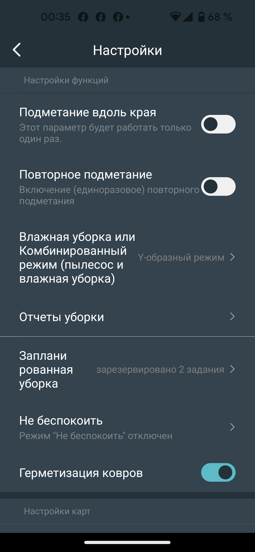 В разделе настроек можно включить режим обхода периметра помещения и двойной уборки. Эти опции включаются однократно для следующего запуска и отключаются автоматически. Для режимов влажной и комбинированной уборки вместо традиционного S-образного движения можно включить Y-образный алгоритм: в этом случае пылесос будет более тщательно протирать участок разворота. В «Отчетах уборки» можно прочитать журнал устройства: в нем хранится время запуска, обработанная площадь и продолжительность работы.