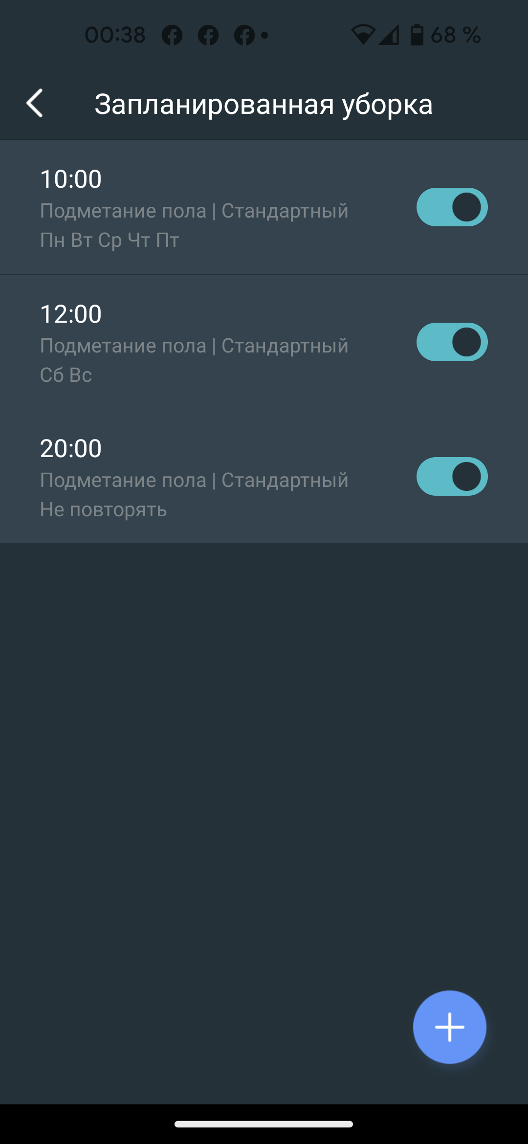 Автоматический запуск можно настроить в любое удобное время суток, указав выполнять сценарий в нужный день недели. При желании в расписании можно задать помещение, в котором следует подмести или помыть пол. Нам показалось удобным запускать полную уборку помещения в 10:00 по будним дням, в полдень по субботам и воскресеньям и вечером, после ужина.