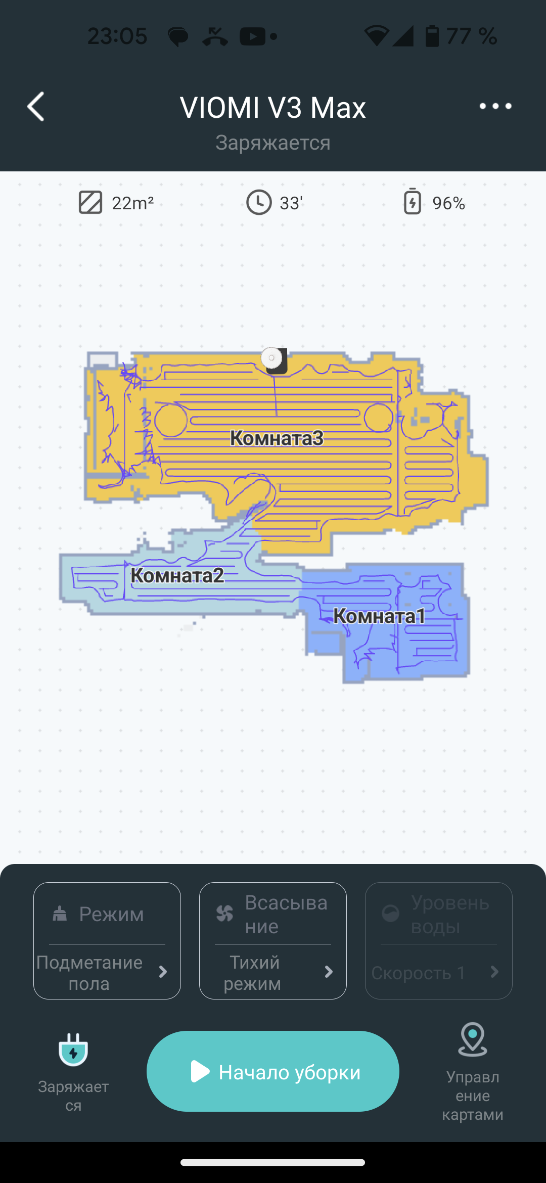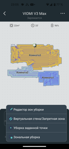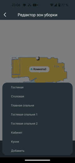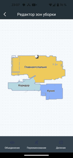После первой уборки в автоматическом режиме на экране появляется карта помещения. Приложение само разбивает его на комнаты, раскрашивая их в разные цвета. Если такая разметка оказалась неточной, это можно исправить с помощью инструмента «редактор карт».