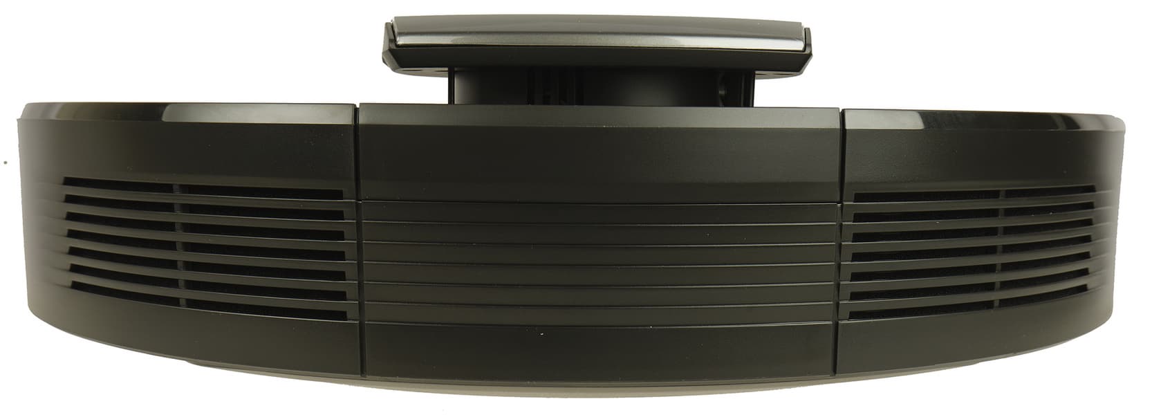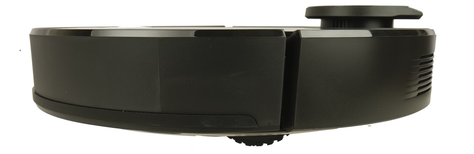 Всю переднюю половину боковой стороны корпуса занимает подвижный бампер, под которым скрываются механические датчики столкновения. В передней части бампера видно окошко из ИК-прозрачного пластика: за ним находятся инфракрасные сенсоры, с помощью которых робот обнаруживает базу.