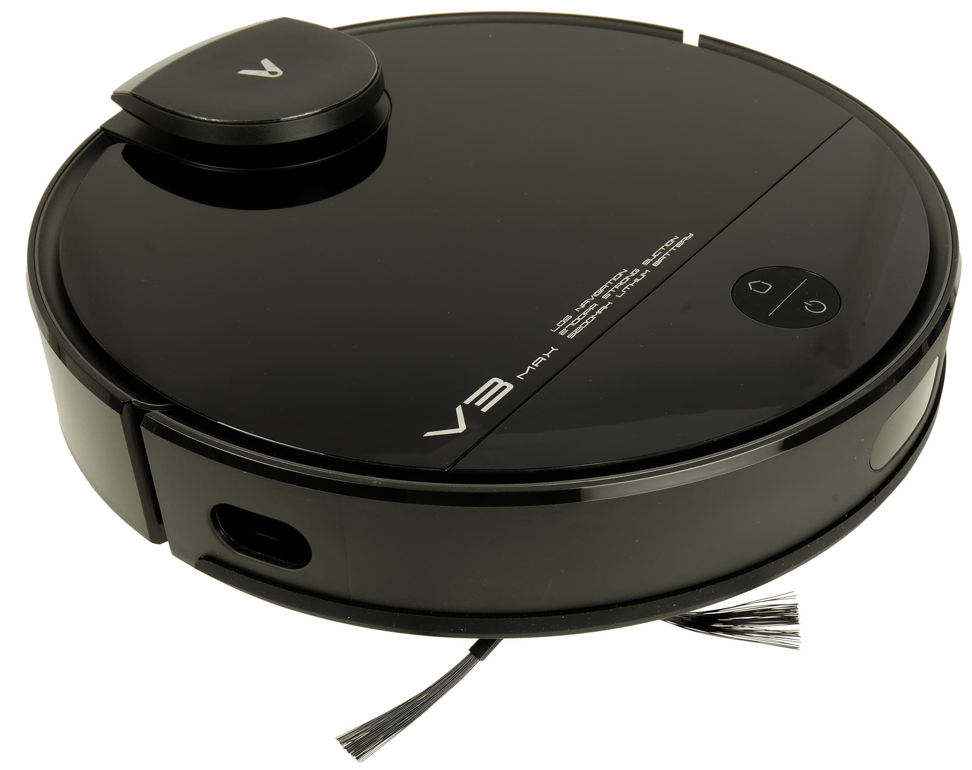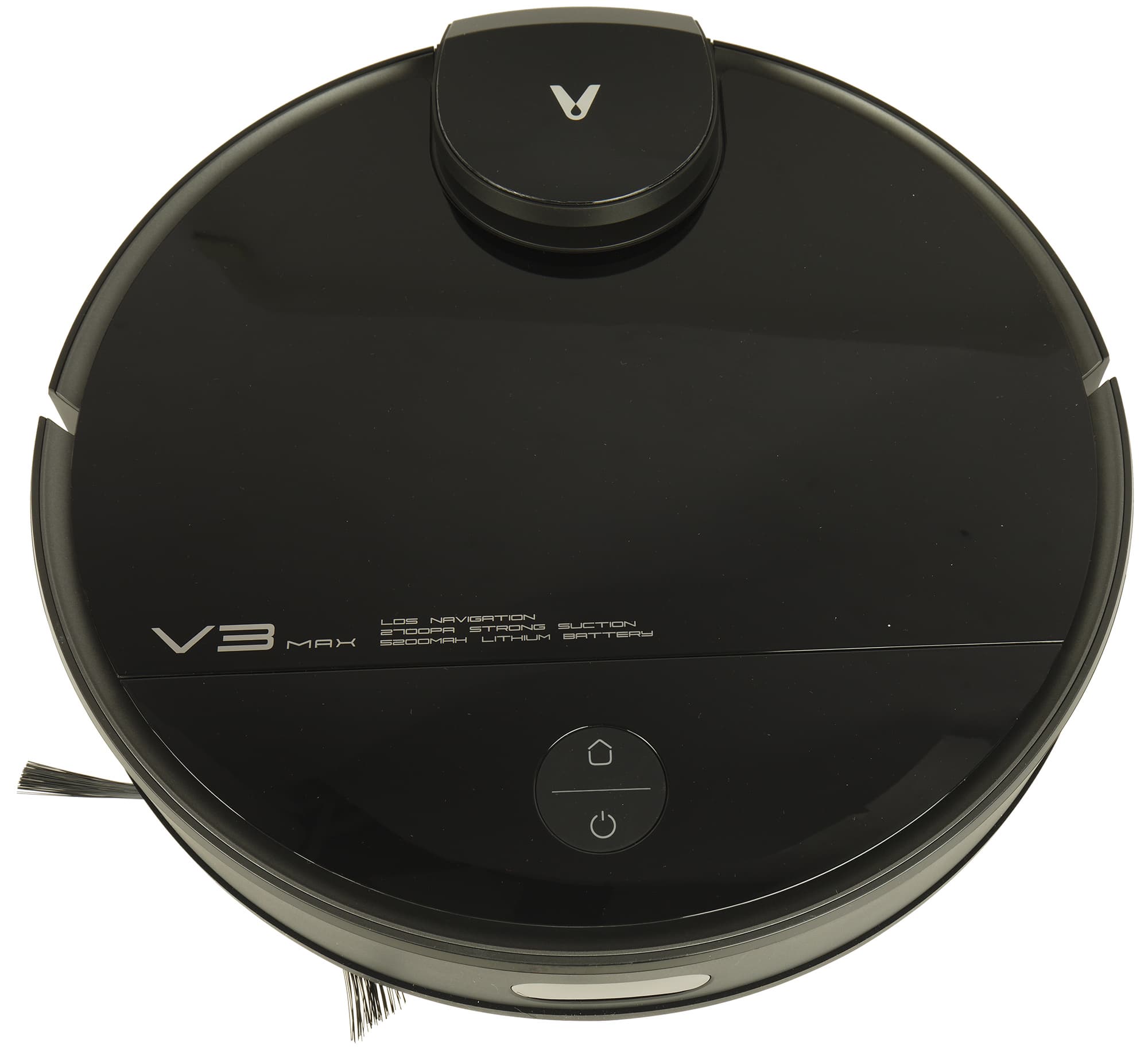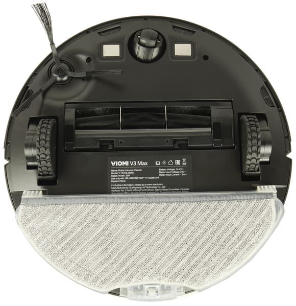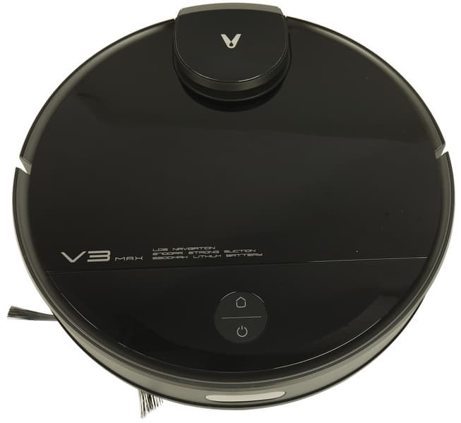 Как и у большинства роботов-пылесосов, у Viomi V3 Max корпус круглый. Но есть существенное отличие, и оно сразу бросается в глаза: башенка лидара расположена не в центре верхней панели, а у заднего ее края. Возвышение, внутри которого вращается лазерный дальномер, закрыто крышкой с логотипом производителя, придающей устройству индивидуальность.