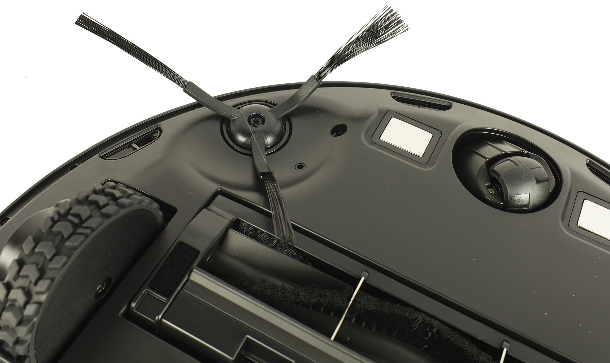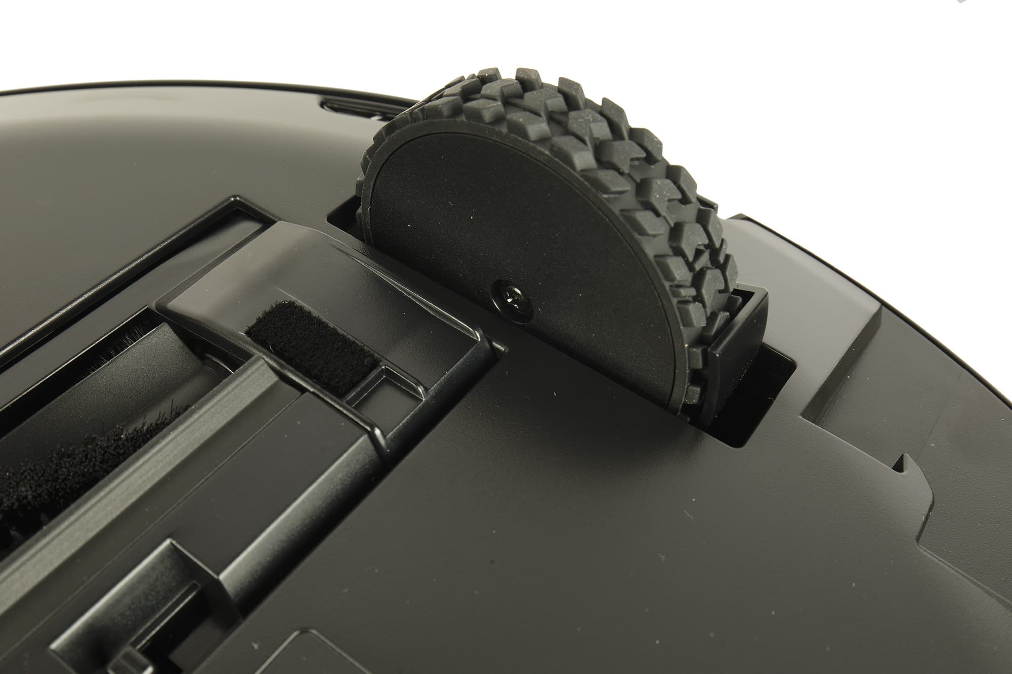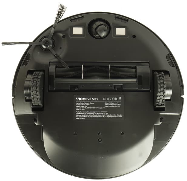 Ходовая часть робота не преподнесла нам сюрпризов: он ездит на двух ведущих колесах с хорошо выраженными резиновыми грунтозацепами. Их подвеска позволяет изменять клиренс от 7 до 35 мм — это обеспечивает устройству хорошую проходимость при преодолении препятствий (порогов и неровностей пола). Опорное колесо в передней части традиционно шарообразное и вращается на 360°. По обеим сторонам от него есть металлические контакты для зарядки на базе.