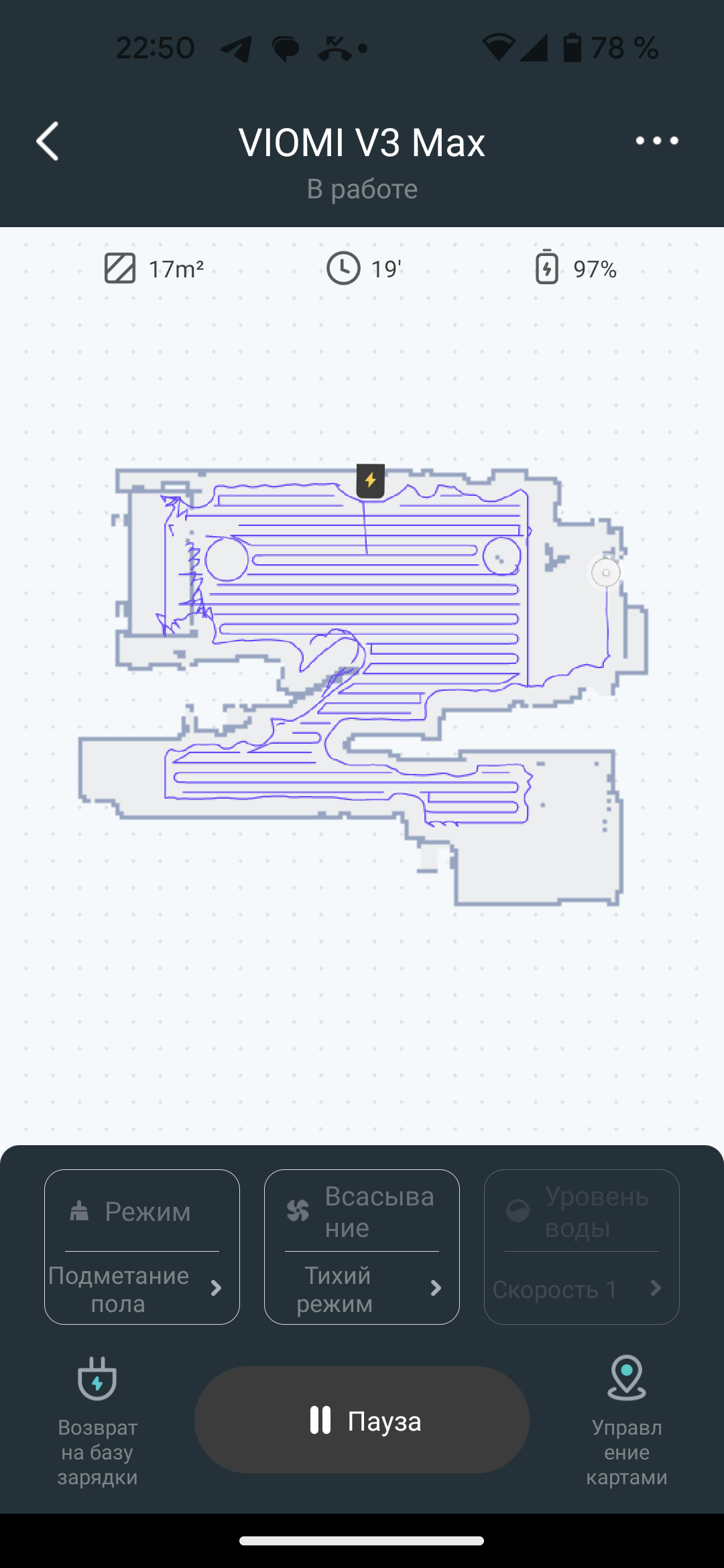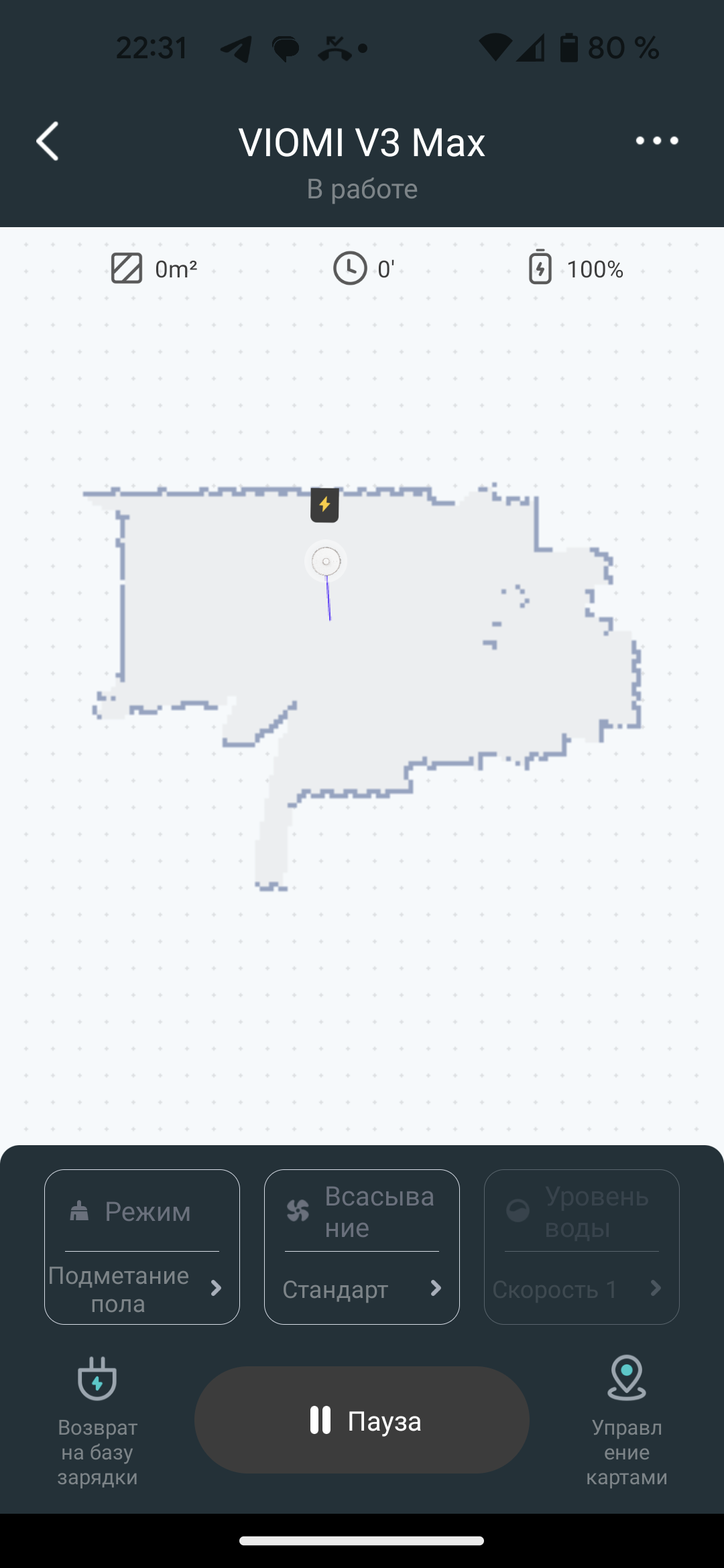 Перед началом тестов мы позволили пылесосу минут пять прогуляться по полигону, чтобы ознакомиться с планом помещения и конфигураций препятствий. Затем вернули его на базу, нарисовали на карте сектор с двукратной очисткой и запустили прибор в автоматическом режиме.