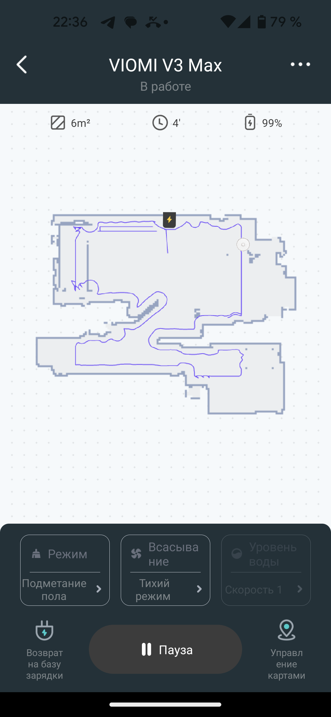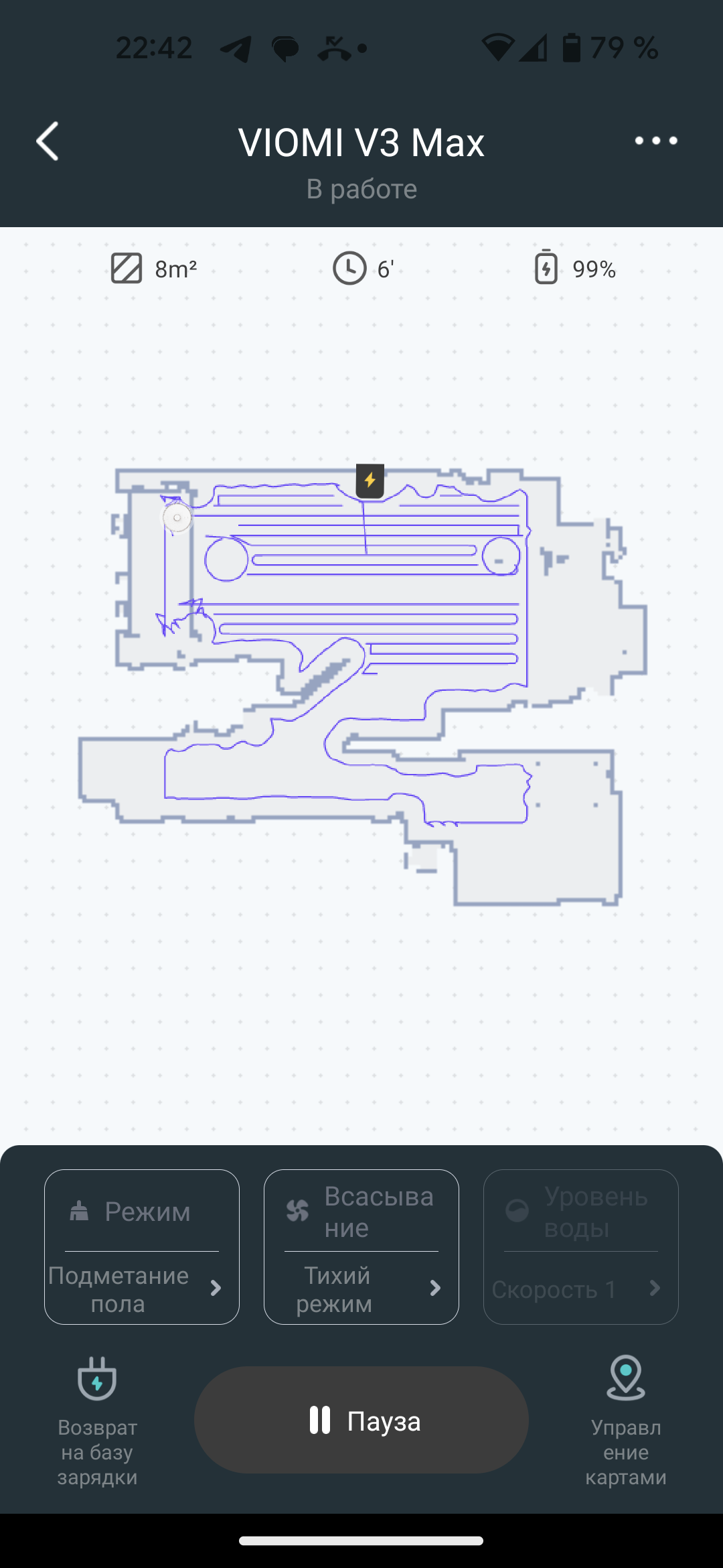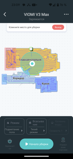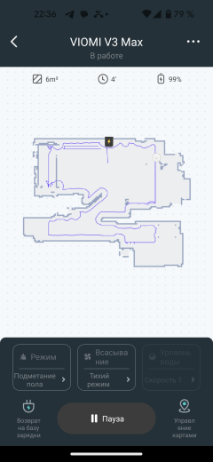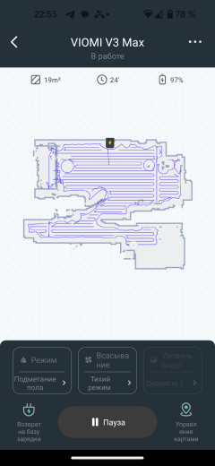 На главном экране приложения мы видим карту помещения, создаваемую с весьма высокой точностью: LDS-сенсор позволяет определять расположение стен и мебели с точностью до миллиметров. В верхней части экрана можно следить за состоянием аккумулятора и оценивать площадь, убранную пылесосом в текущем цикле работы.